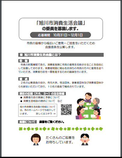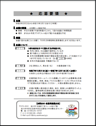 | 応募方法 | 消費生活センター(1の8 フィール旭川7階)、市政情報コーナー(総合庁舎1階)、各支所及び東部まちづくりセンターに備えおいてある所定の応募用紙又は市のホームページから印刷した応募用紙に必要事項を記入の上、持参、郵送、ファックス又はEメールで消費生活センターに提出してください。 |
