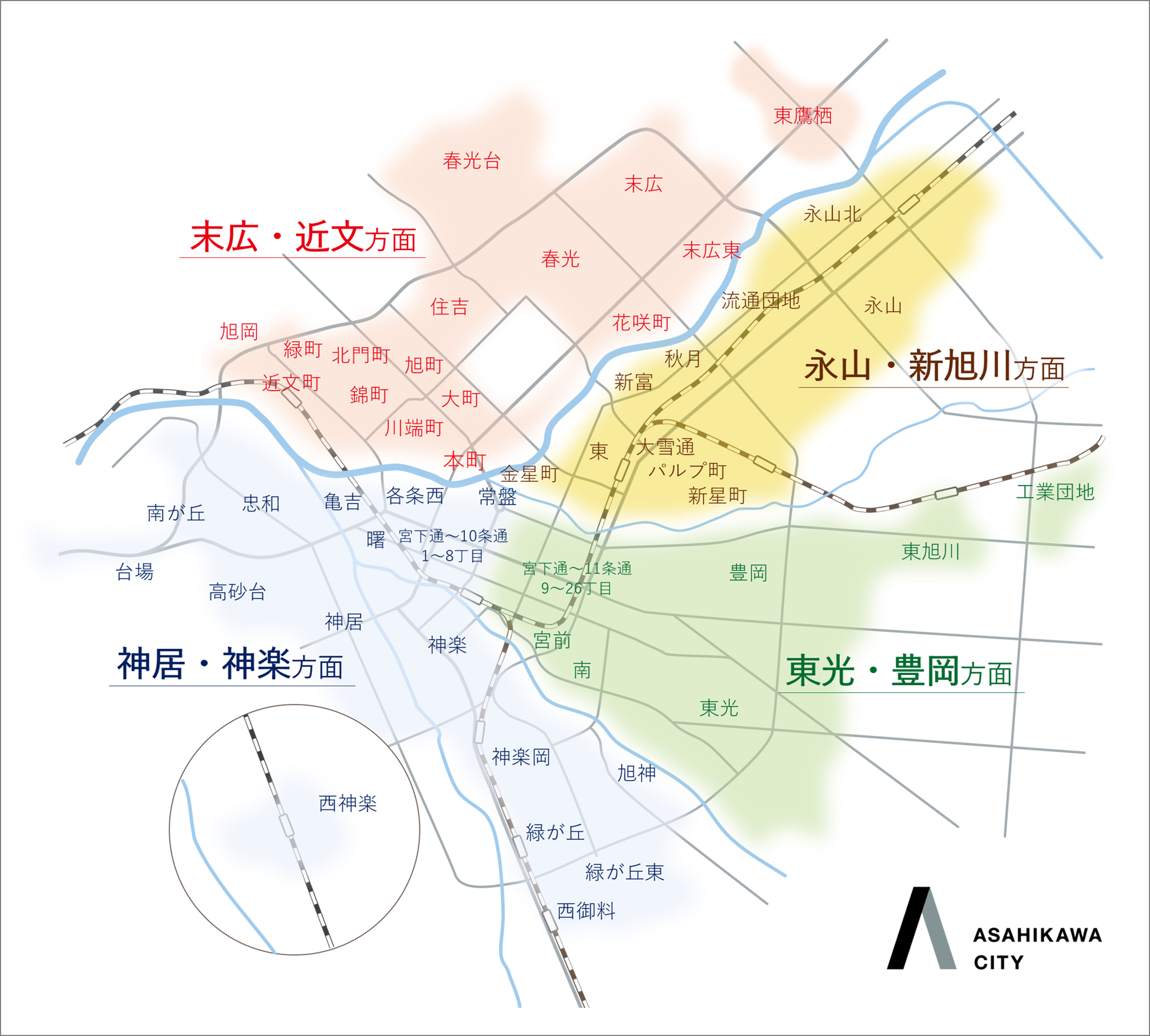 旭岡・旭町・大町・川端町・春光・春光台・末広・住吉・近文町・錦町・花咲町・東鷹栖・北門町・ 緑町・本町 | |