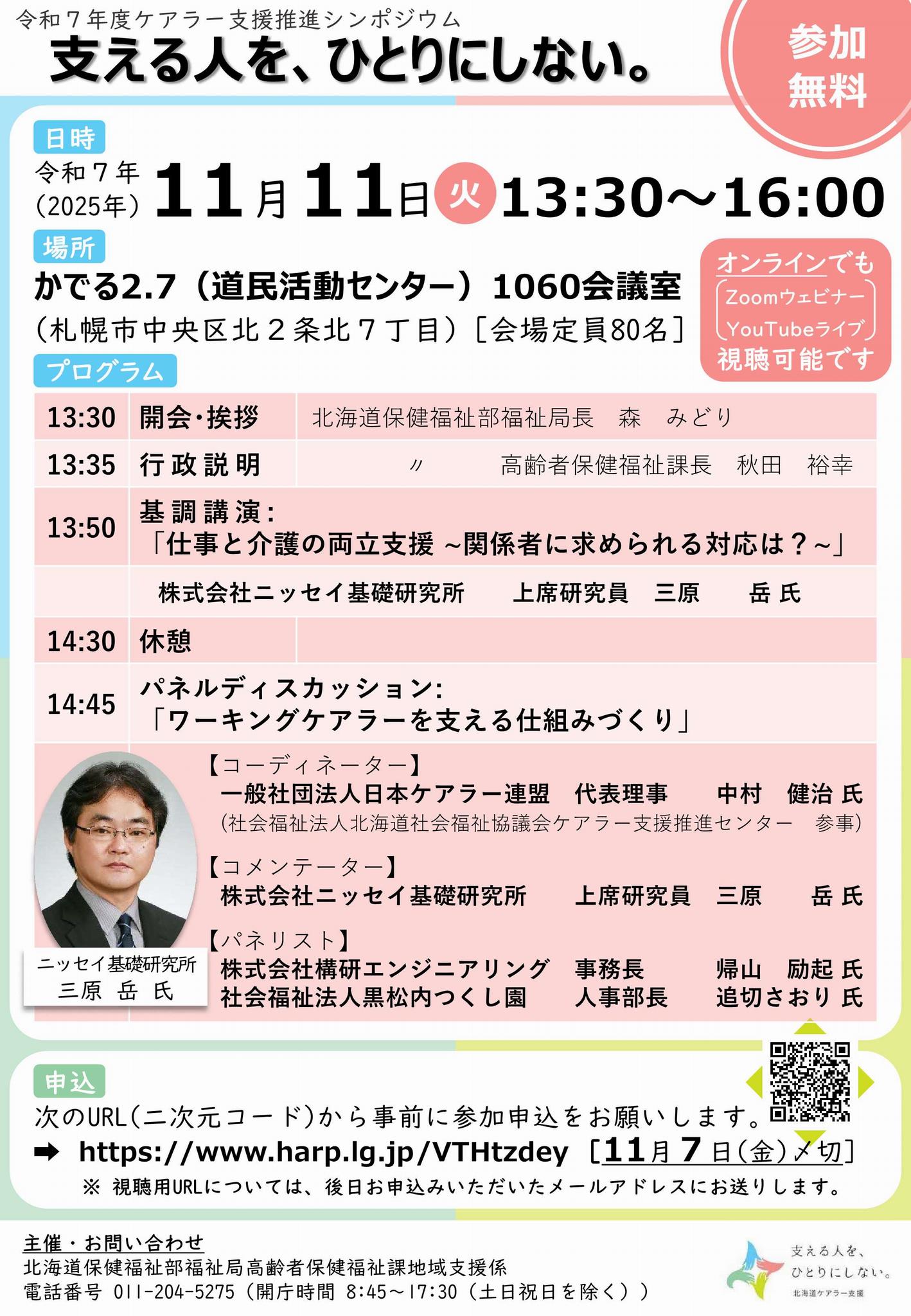 北海道より、「ケアラー支援推進月間」である11月に標記シンポジウムの開催案内がありましたのでお知らせいたします。