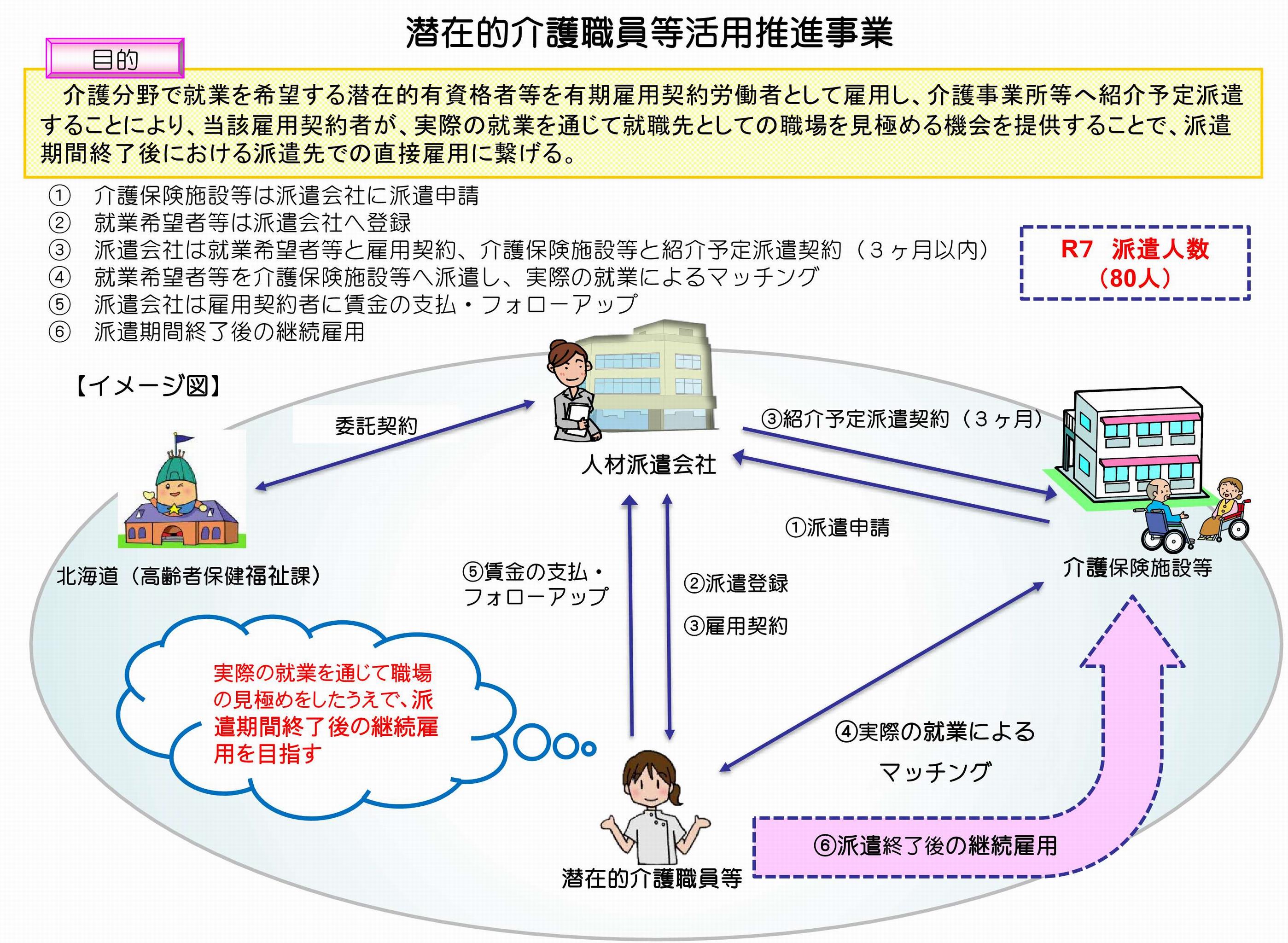 派遣職員の雇用及び対象施設等への派遣は委託事業者(株式会社スタッフサービス)が行い、派遣に係る費用は北海道が負担します。