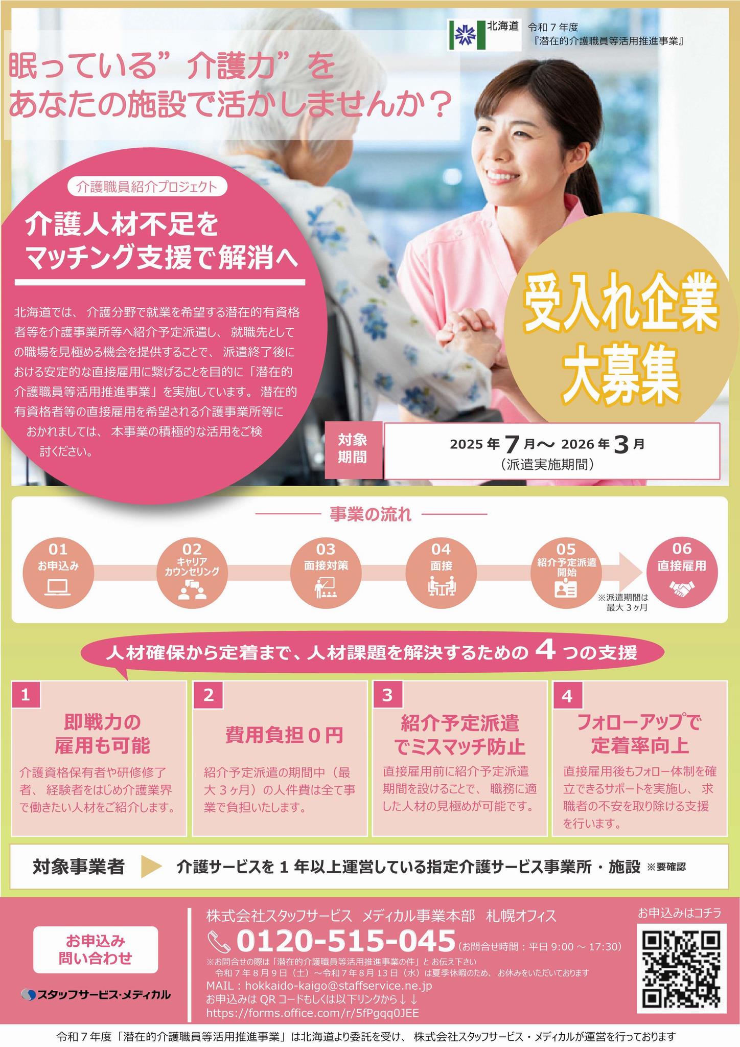 北海道保健福祉部福祉局高齢者保健福祉課より、令和7年度潜在的介護職員等活用推進事業の実施について周知依頼がありましたので、お知らせします。