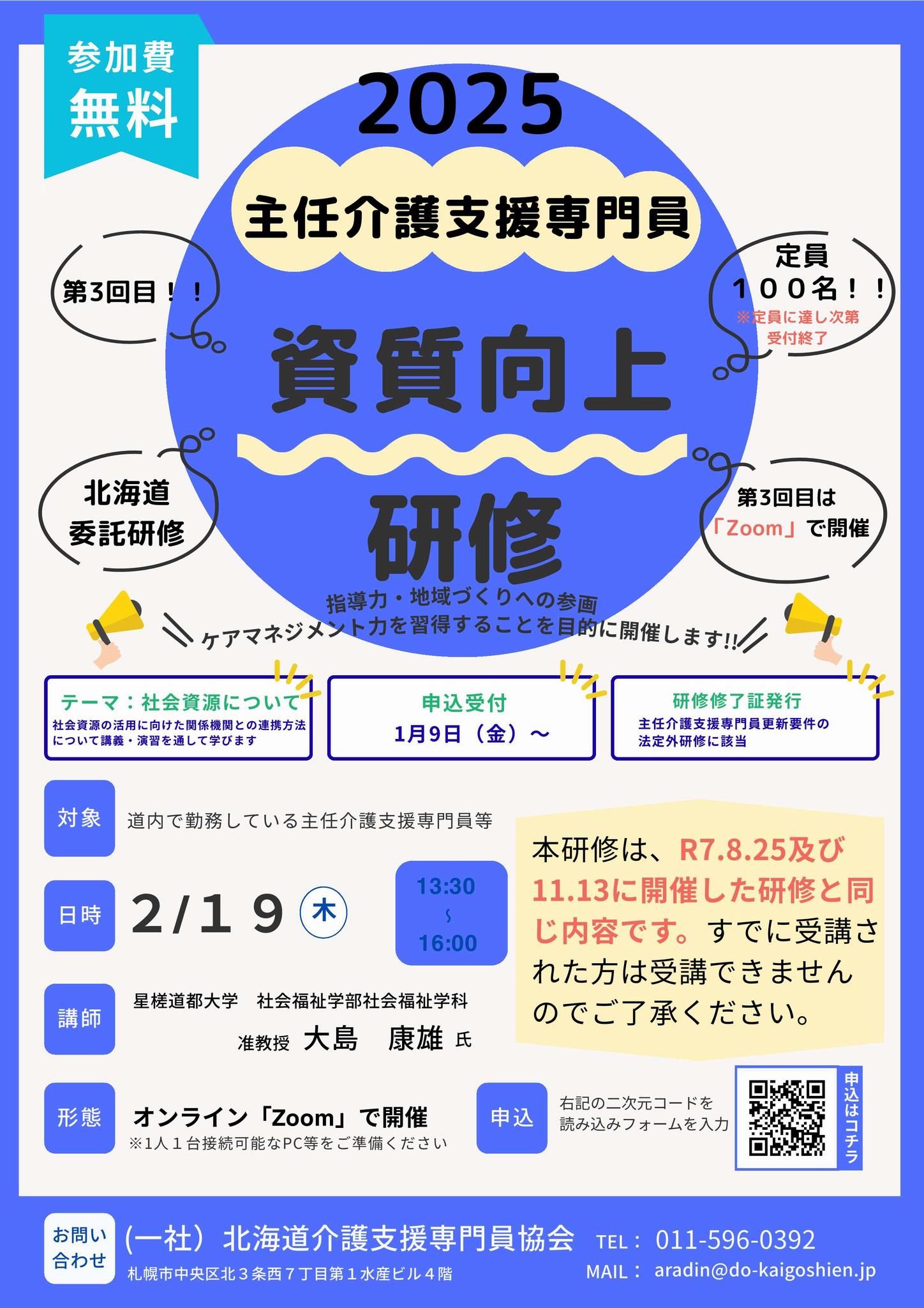 北海道の委託事業として、一般社団法人 北海道介護支援専門員協会が令和7年度第3回主任介護支援専門員資質向上研修を開催します。 ご興味のある方は是非お申し込みください。