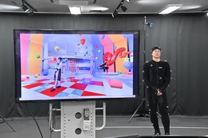 3DCGのキャラクター(アバター)が、マーカー付きスーツを着た人と同じ動作をできるのがモーションキャプチャー。今人気の、CGキャラが演者として出演する「VTuber(ブイチューバー)動画」に欠かせない技術です。社内には専用スーツや何台ものカメラ、背景合成などの環境が揃った、誰でも使える時間貸しスタジオが。ここで動画制作を完結できます。