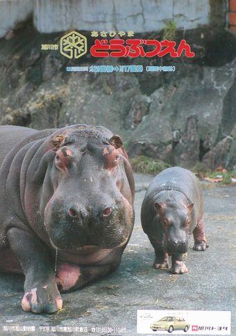 この年は前年にうまれたカバの親子がモデルとなっています。この仔「ナミコ」も冬には雪の上を走り回ったそうです。 なお、ナミコは平成16年神戸市王子動物園に旅立ちました。