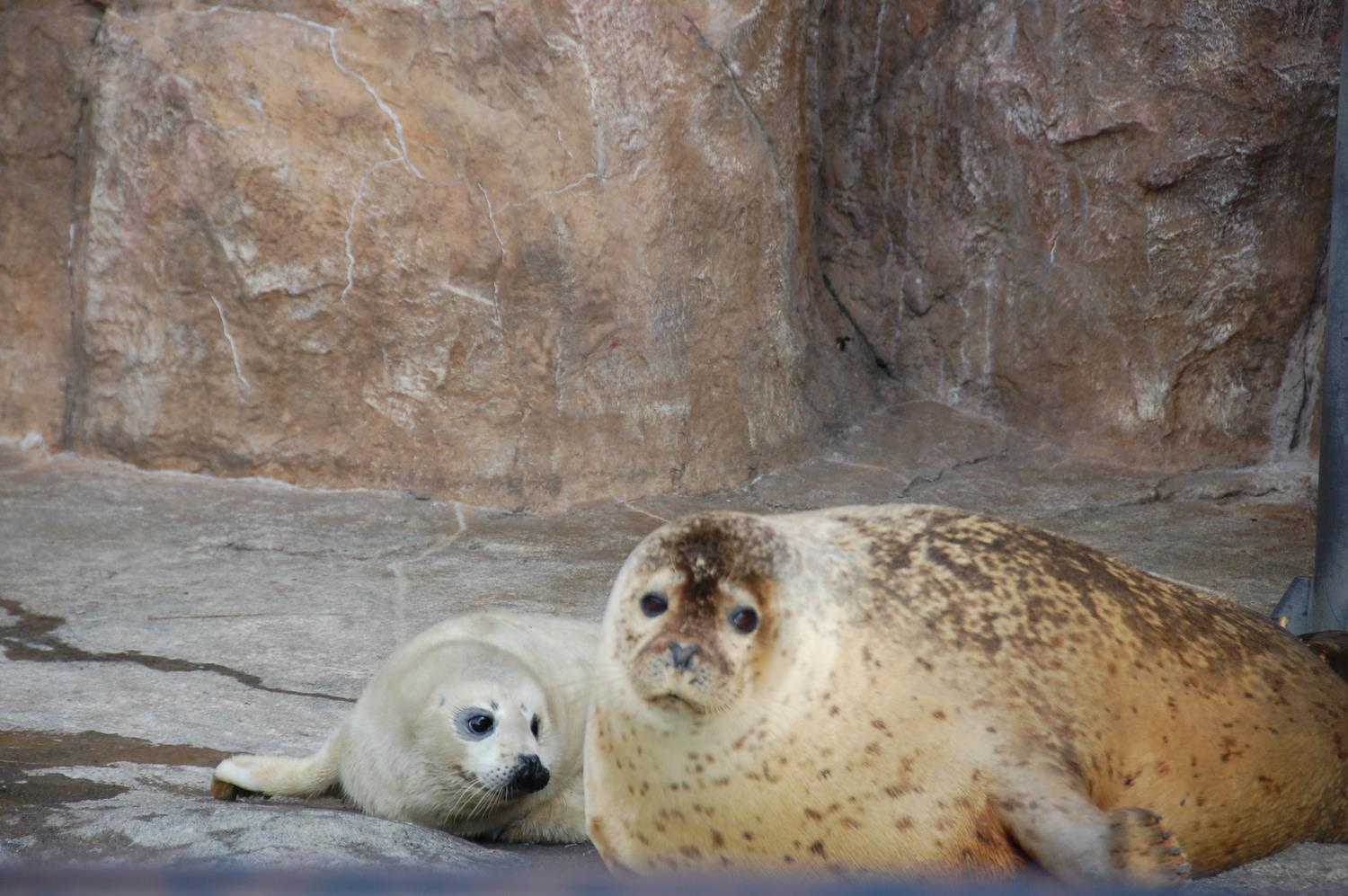 今年の雪解けは嬉しいことがありました。ゴマフアザラシの仔が2頭続けて生まれ、しかも2頭とも親が哺育をしています。実は複数の親が同時に哺育したのは旭山では初めてのことです。一昨年も同じ親がそれぞれ出産したのですが、一頭は親が育児をしなかったため(育児放棄)人工保育となっていました。