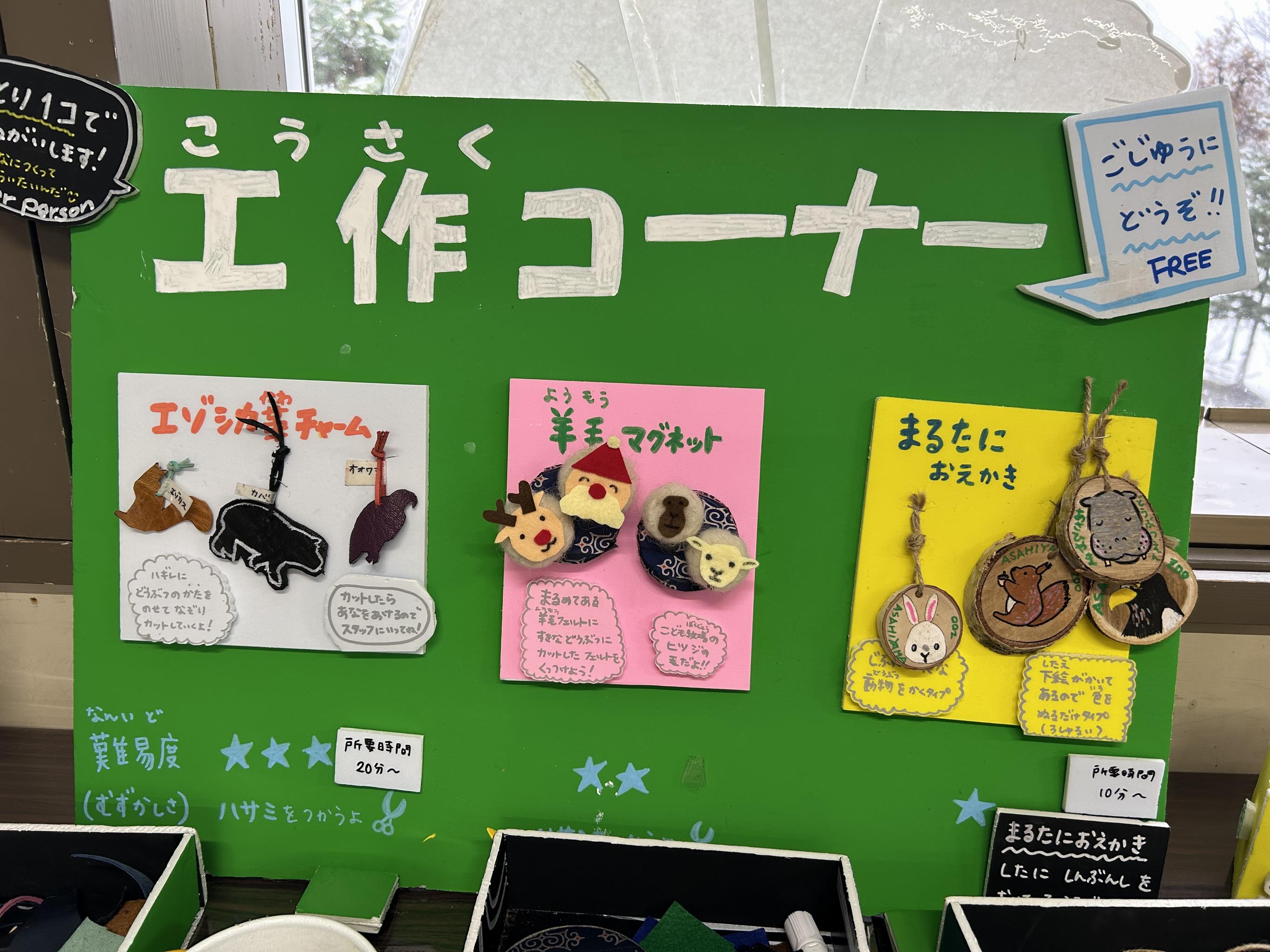 冬期開園も始まり、動物図書館では、館内をプチリニューアル。人気の工作コーナーでは、冬期限定の「羊毛マグネット」が登場(こども牧場のヒツジの毛を使用しています)。「エゾシカ革チャーム」、「まるたにお絵かき」は新たな動物が登場しています。1日の作れる数に限りがありますので、作りたい方はぜひ動物図書館へお越しください!