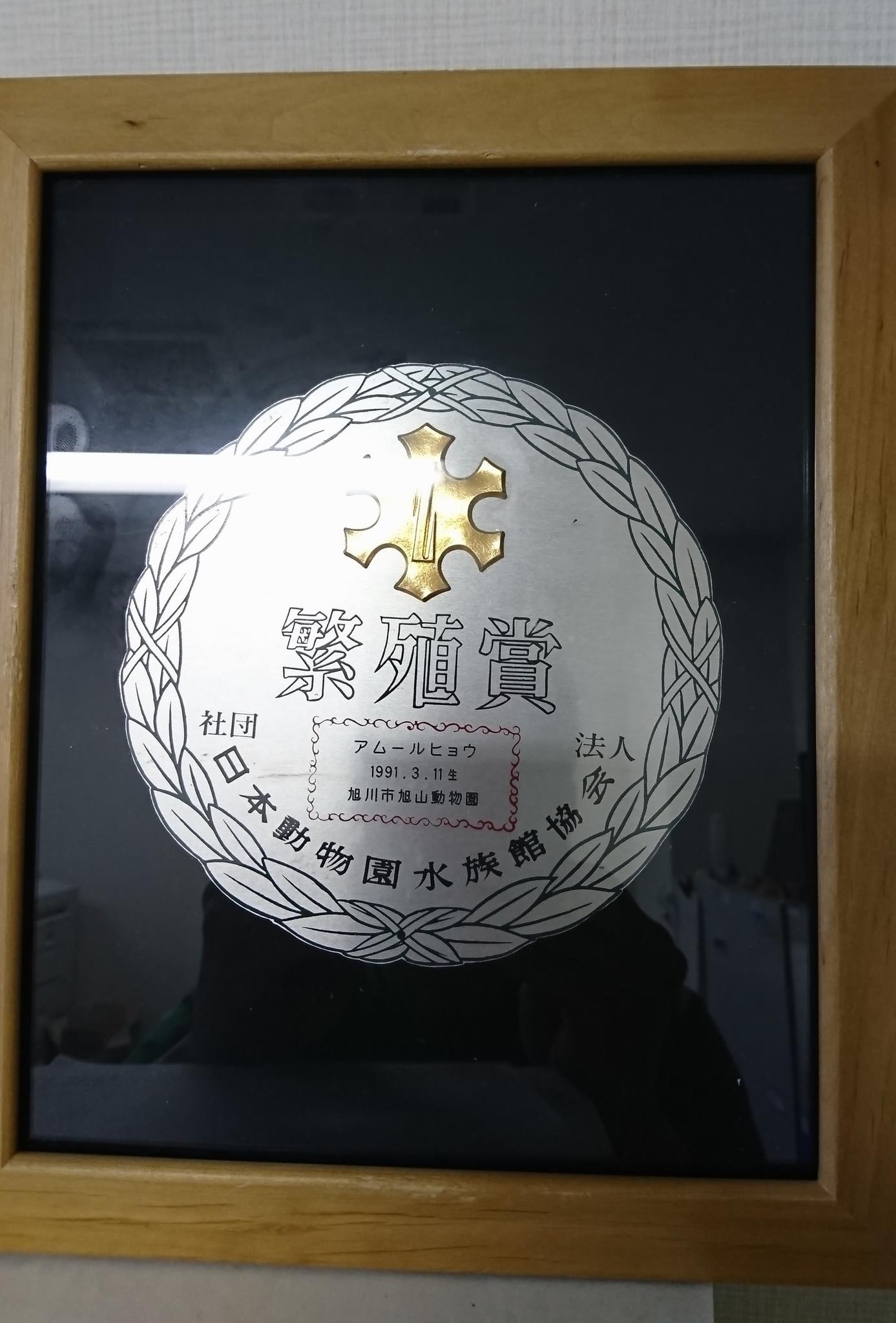 1991年に動物園水族館協会から贈られた「繁殖賞」の楯。