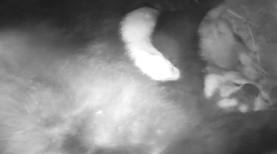 産まれて3日目位までは、渝渝は飲食と排泄以外は産箱に籠もりきりで、授乳と毛づくろいを行っていました。食事中だろうと、仔が鳴き始めればすっ飛んで戻っては毛づくろいをして、眠っては仔が泣き始めると起きて毛づくろいをしてと、大忙しな様子でした。