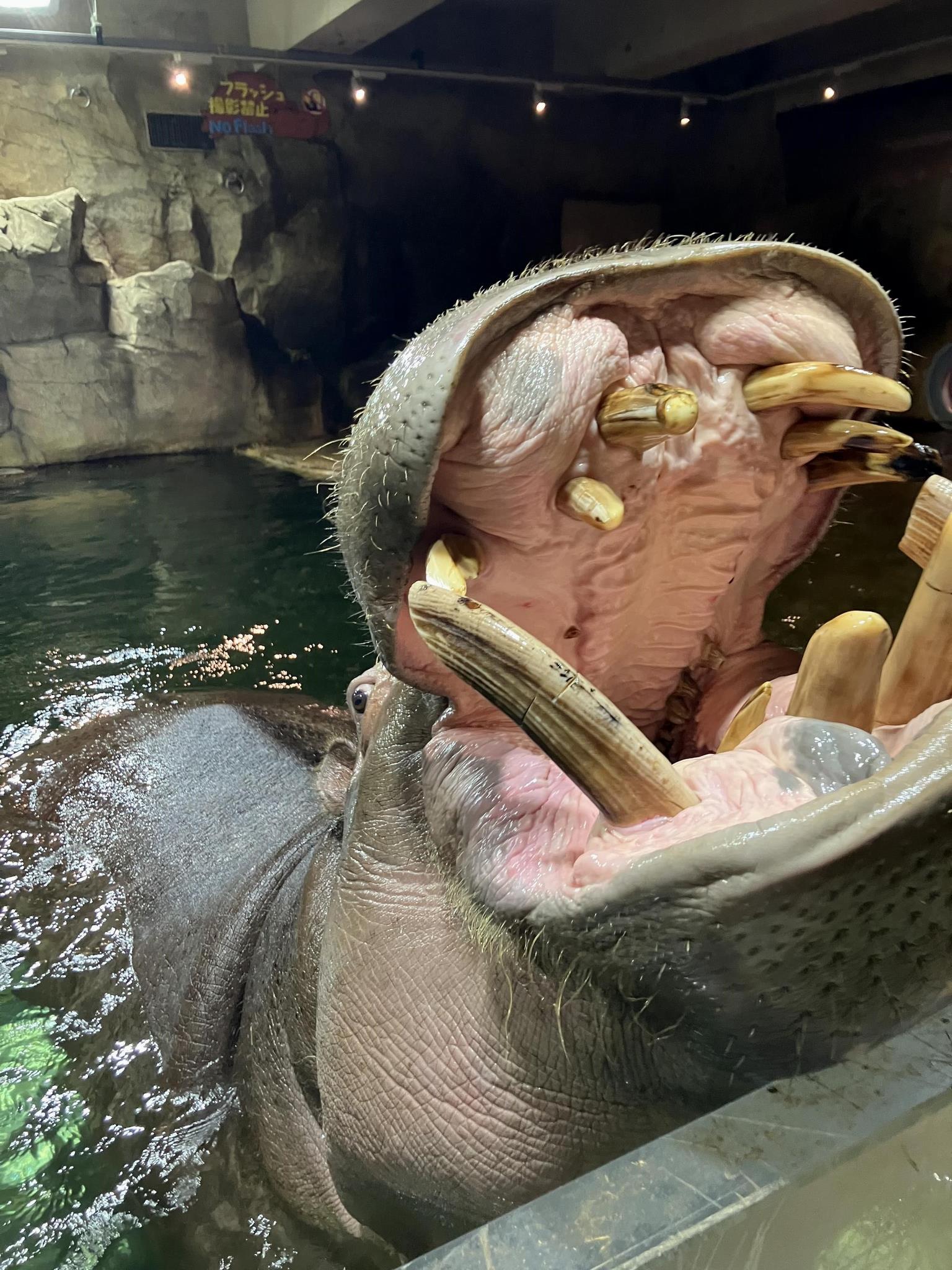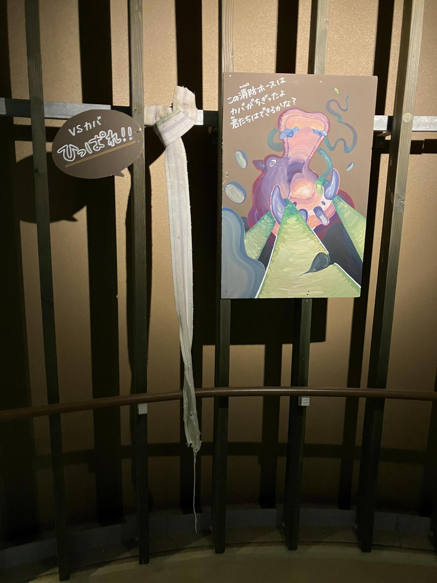 もともとカバのおもちゃ用に設置していた消防ホースだったのですが、百吉(モモキチ)が千切ってしまったので、カバのパワーを直接体験するのにちょうどいいと思い破壊した実物を展示した次第です。 展示に使用していたホースは多少の欠けはあったにせよ、鈴木さん(本文章を書いている張本人。毎日50キログラムのハンドグリップを握りながら出勤している)や杉谷さん(元北海道日本ハムファイターズ)でも全くビクともしなかったので、どれほどのムキムキマンがやったのかシンプルに興味があるのです。ちなみに消防ホースは、純粋に引っ張って千切るのに最低2t以上の力が必要になるそうです。
