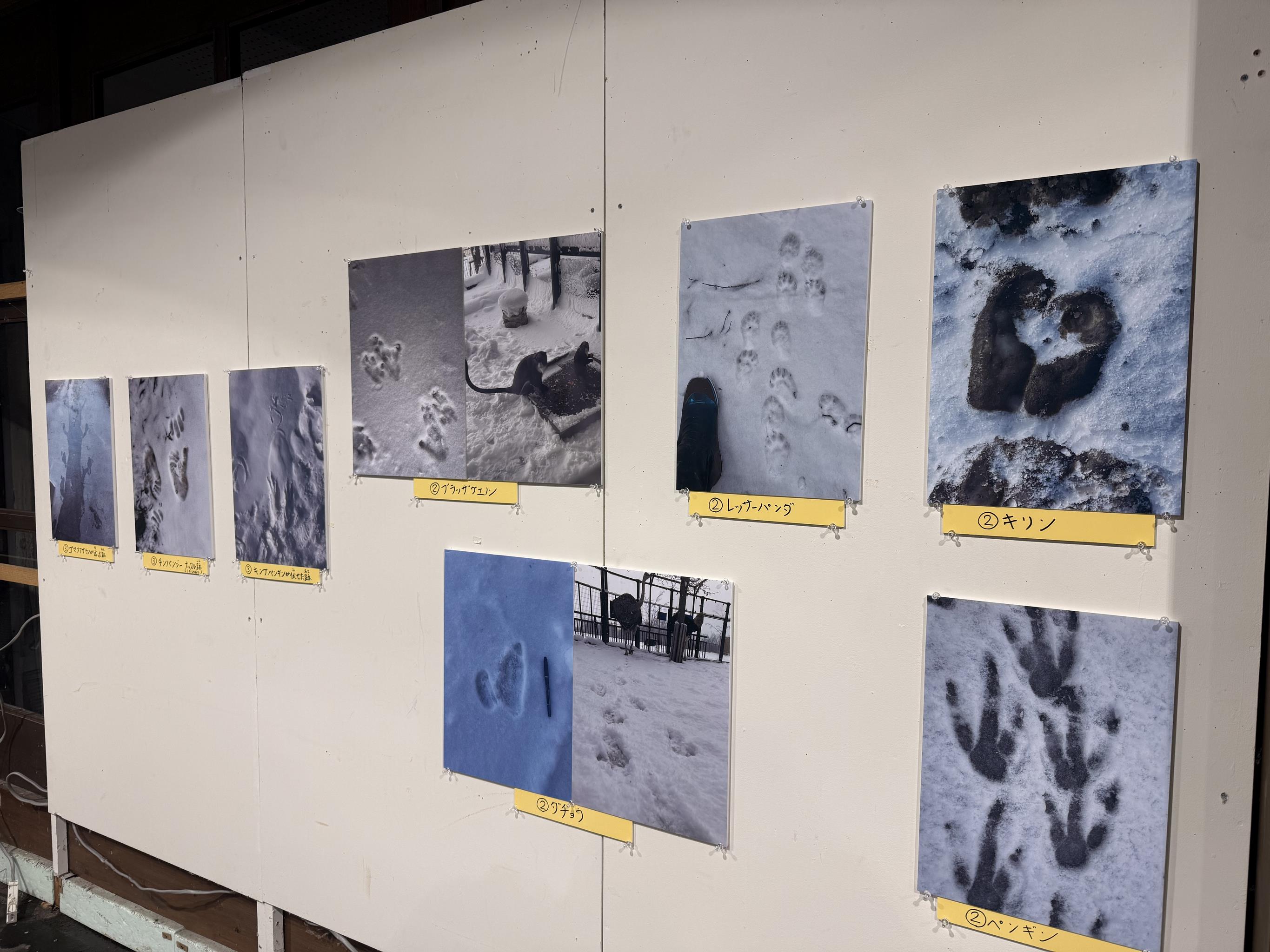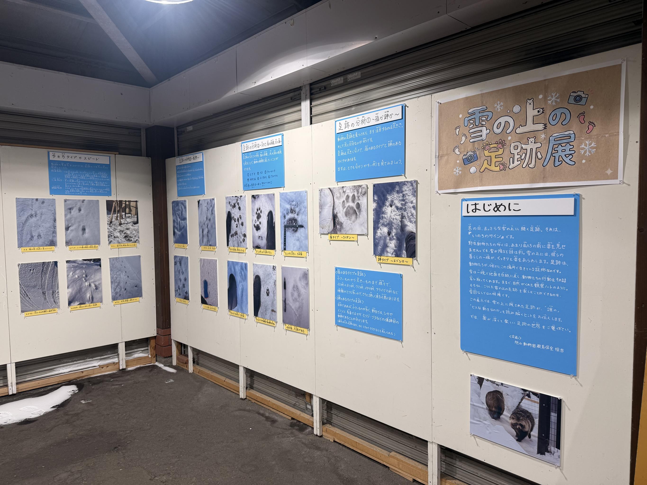 雪の上に残された足跡が、「誰の」「どんな動きなのか」を読み解くヒントをお伝えする「雪の上の足跡展」を開催しています。飼育スタッフが発見した、旭山動物園の様々な動物の足跡を、楽しい解説とともに展示しています。