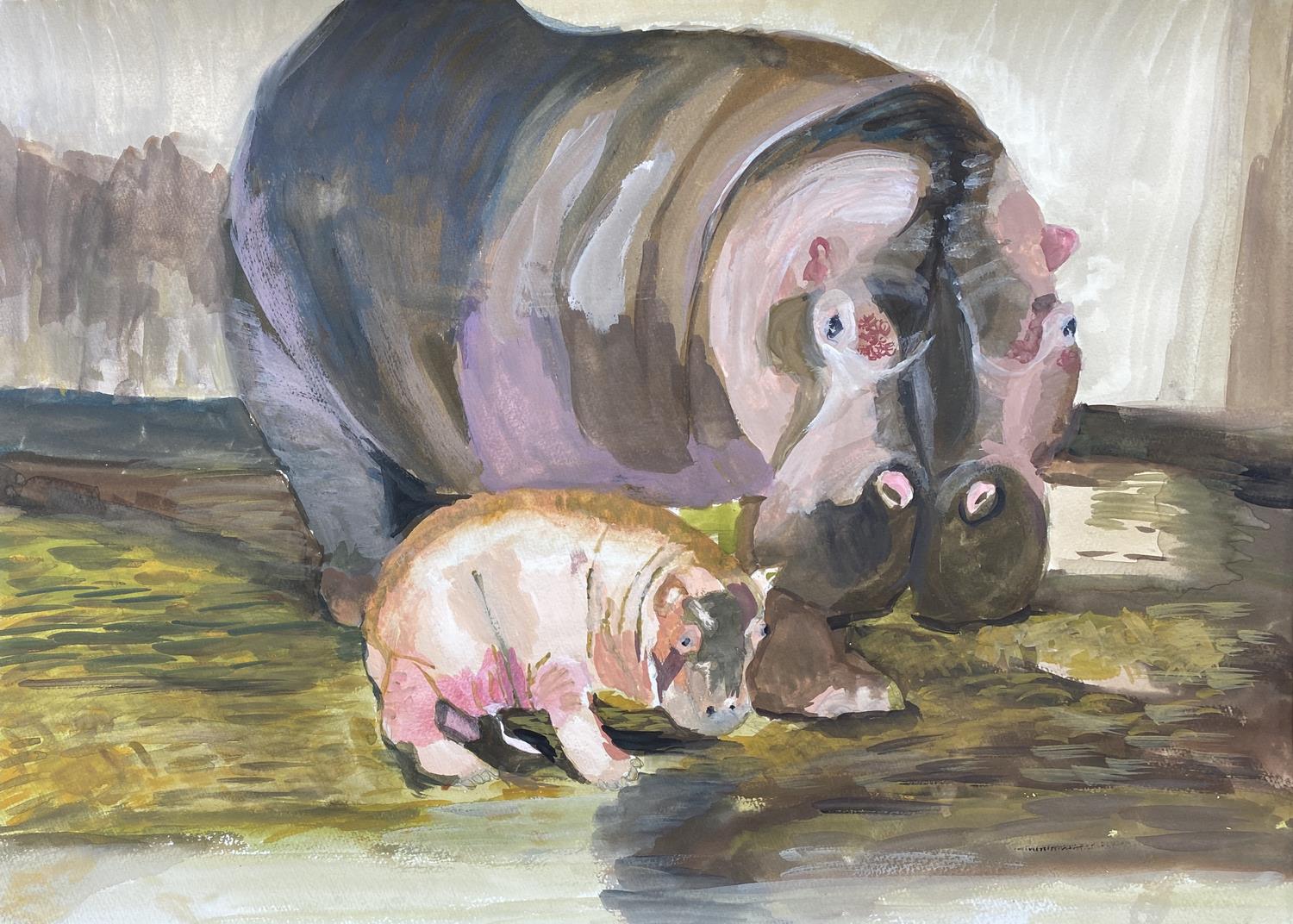 健康のために短時間でも日光に当たらせたい飼育係と、暖かい部屋でぬくぬく過ごしたいカバとのせめぎ合いの毎日です。