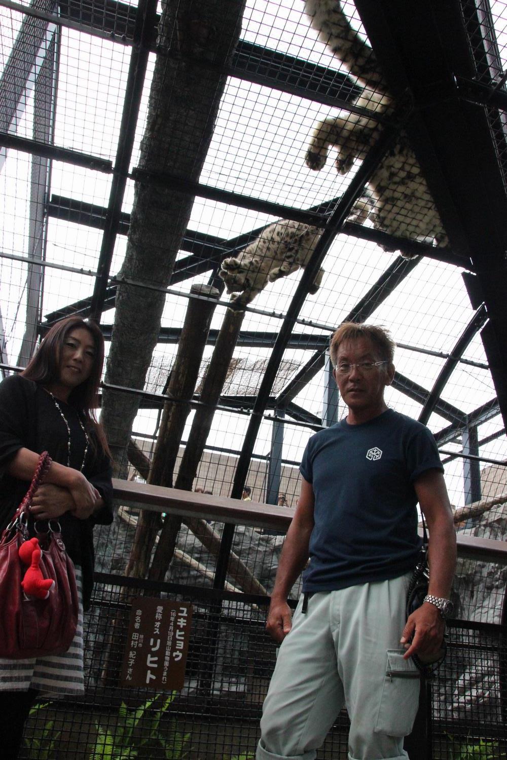 (ユキヒョウ親子、田村さん、坂東園長で記念撮影!)