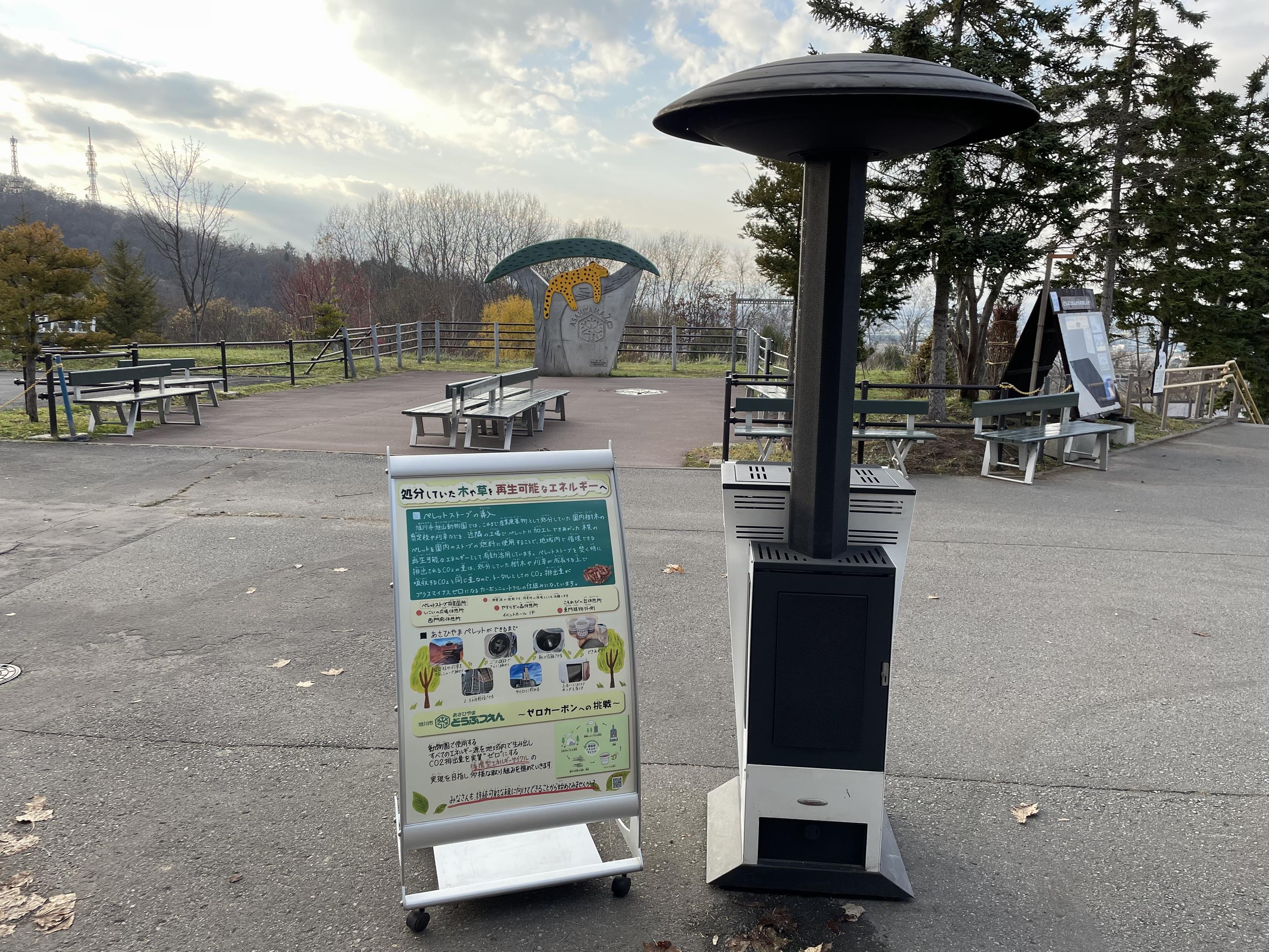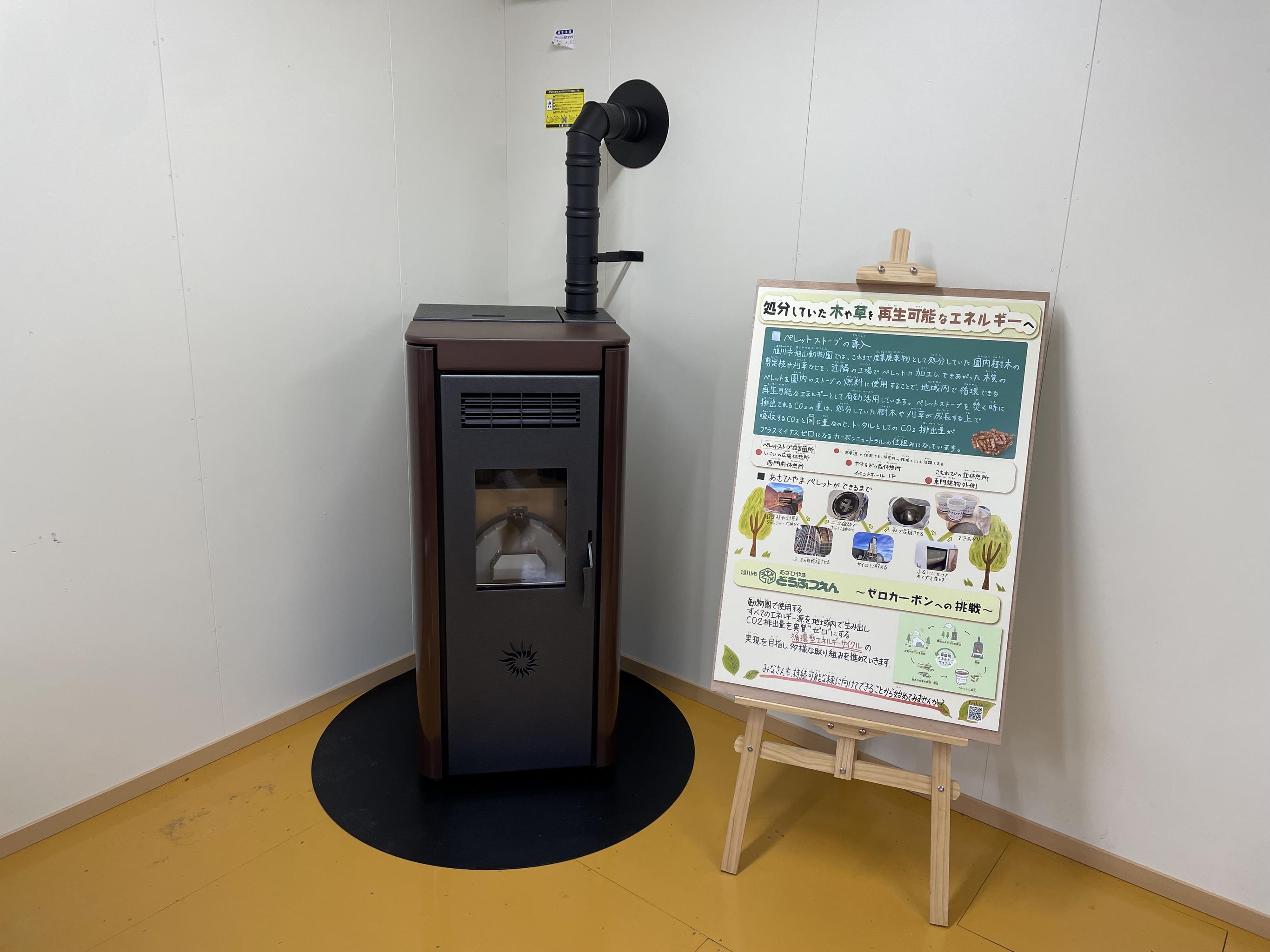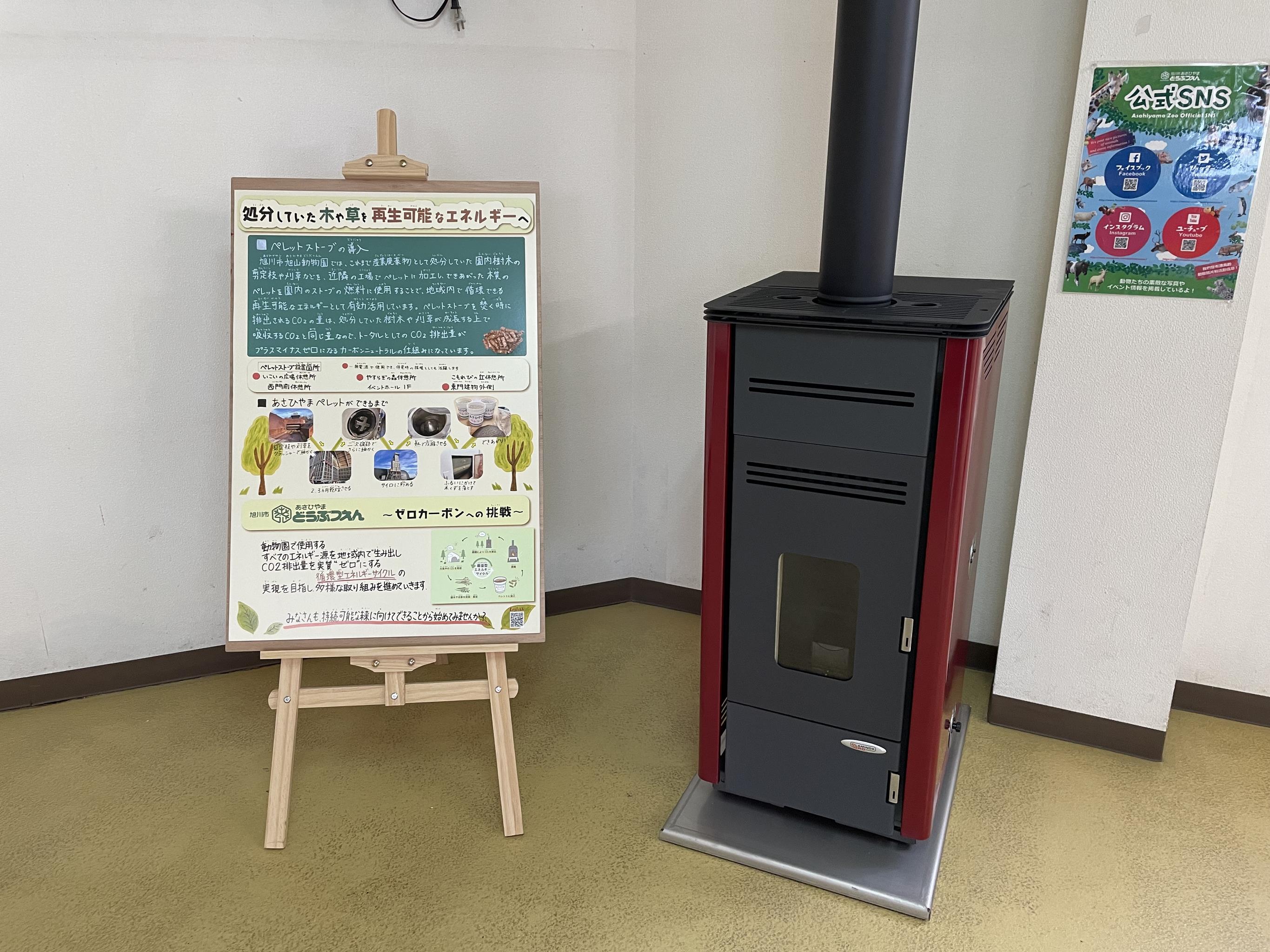 これまで産業廃棄物として処分していた園内樹木の剪定枝や刈草などを、近隣の工場でペレットに加工し、出来上がった木質のペレットを園内のストーブの燃料に使用することで、地域内で循環できる再生可能なエネルギーとして有効活用しています。ペレットストーブを焚く時に排出されるCO2の量は、処分していた樹木や刈草が成長する上で吸収するCO2と同じ量なので、トータルとしてのCO2排出量がプラスマイナスゼロになるカーボンニュートラルの仕組みになっています。