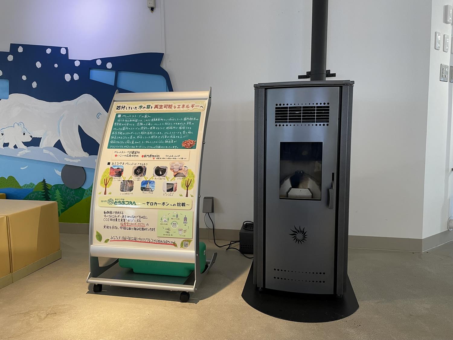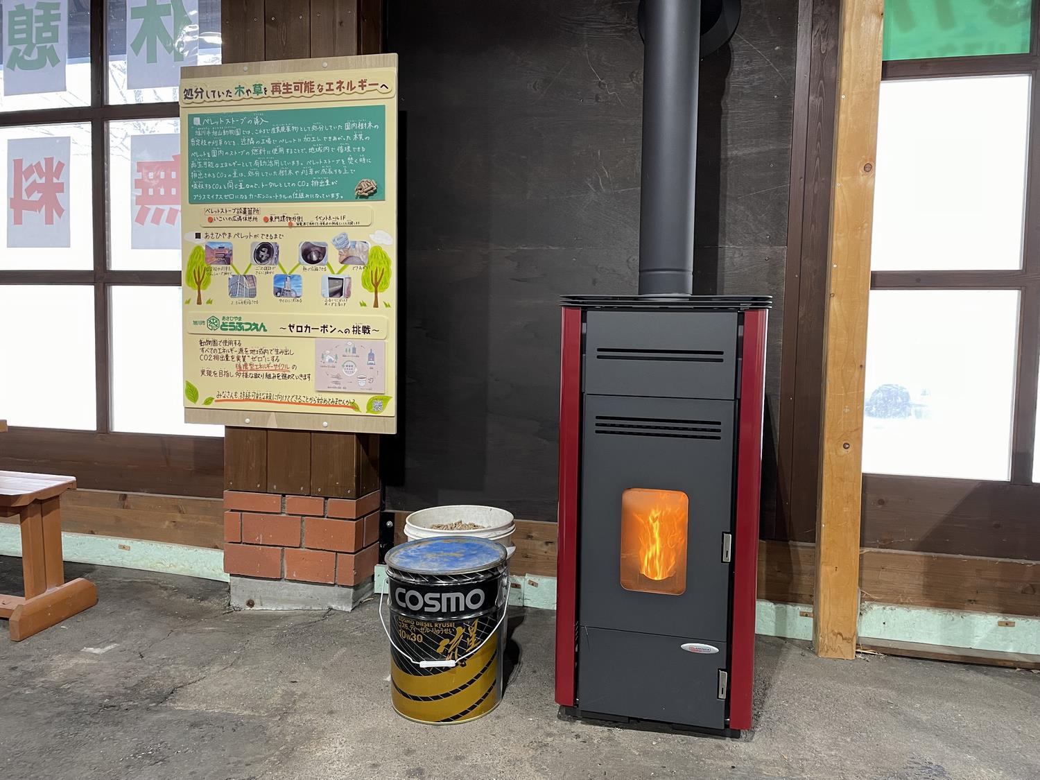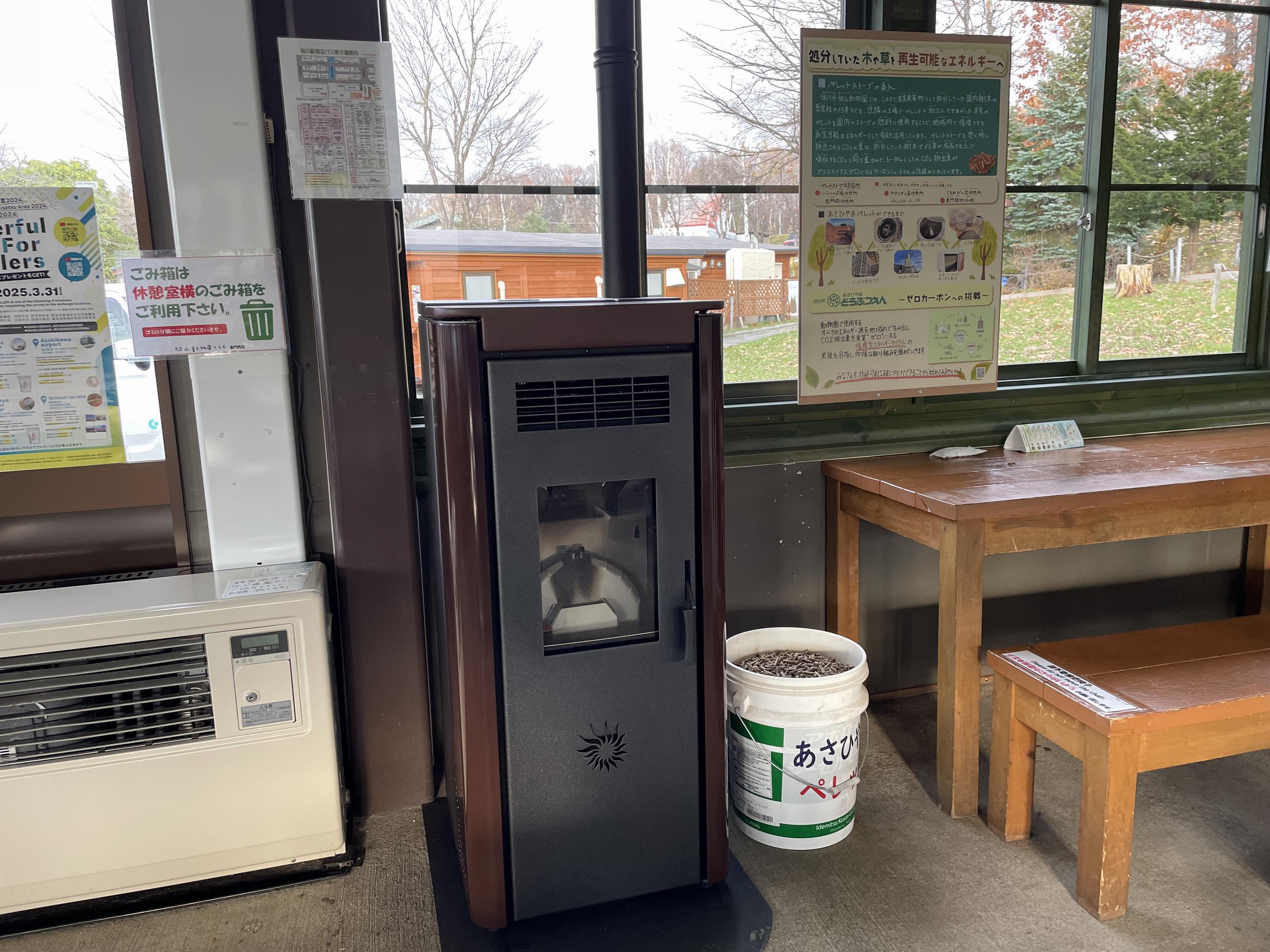 これまで産業廃棄物として処分していた園内樹木の剪定枝や刈草などを、近隣の工場でペレットに加工し、出来上がった木質のペレットを園内のストーブの燃料に使用することで、地域内で循環できる再生可能なエネルギーとして有効活用しています。ペレットストーブを焚く時に排出されるCO2の量は、処分していた樹木や刈草が成長する上で吸収するCO2と同じ量なので、トータルとしてのCO2排出量がプラスマイナスゼロになるカーボンニュートラルの仕組みになっています。