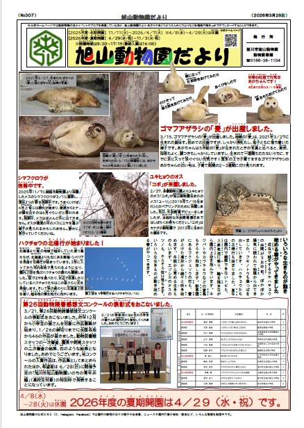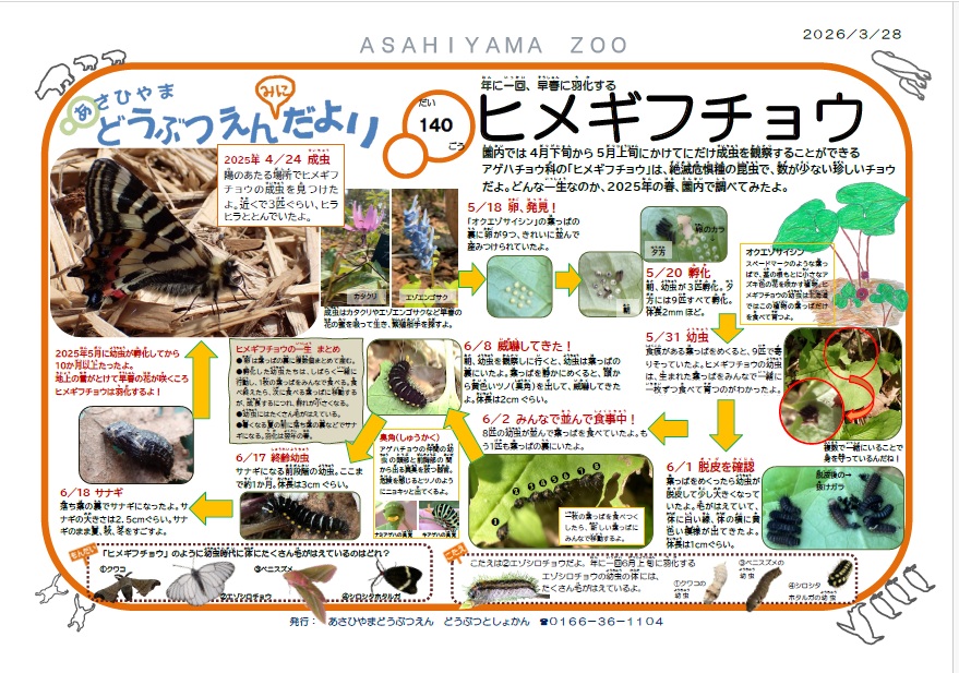 動物園だより307号では、ゴマフアザラシの「麦」の出産や、シマフクロウが抱卵中であることのほか、 動物読書感想文コンクールの表彰式を行ったことなどを紹介しています。 みにだより140号では、4月上旬から5月上旬にかけてだけ成虫を観察できる 「ヒメギフチョウ」の一年を紹介しています。 ぜひ紙面で旭山動物園の春を感じてください。