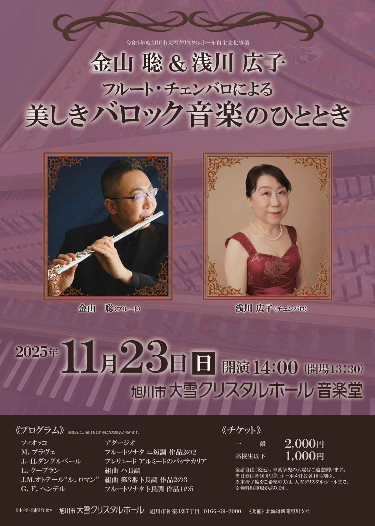 「金山 聡 & 浅川 広子~フルート・チェンバロによる美しきバロック音楽のひととき」開催のお知らせ♫