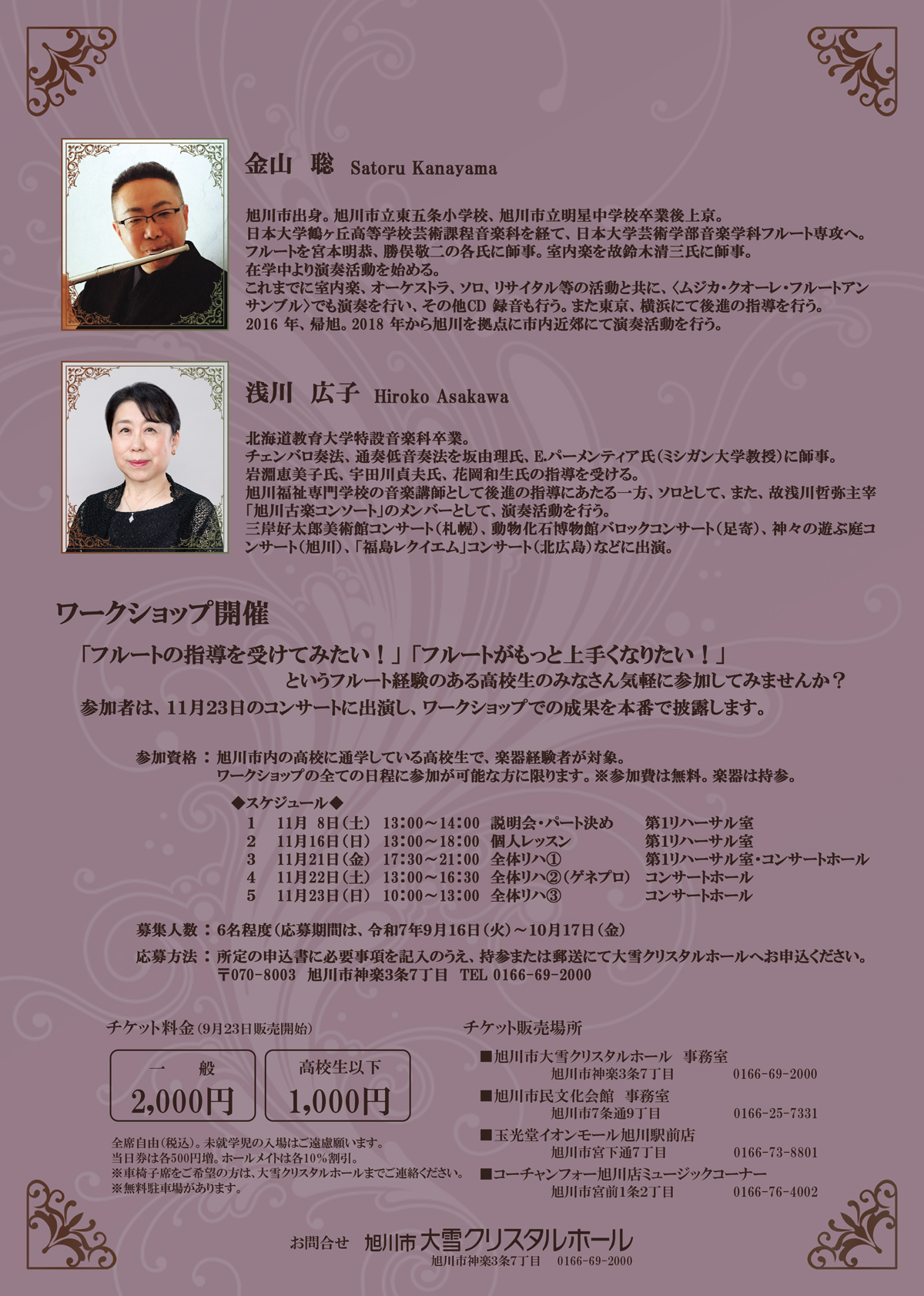 「フルートの指導を受けてみたい!」「フルートが、もっと上手くなりたい!」というフルート経験のある高校生のみなさん、気軽に参加してみませんか?