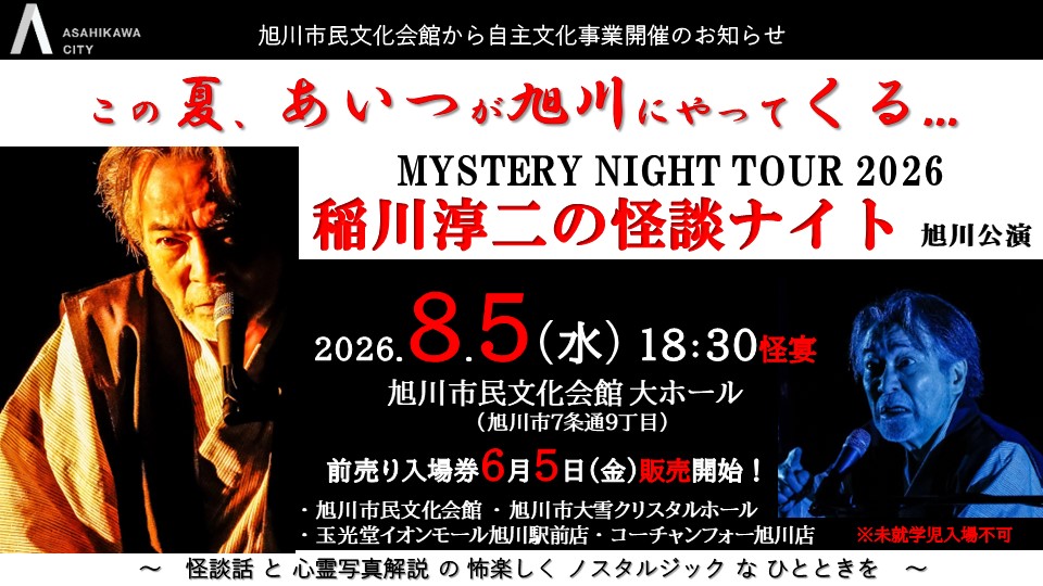 【速報】令和8年度旭川市民文化会館自主文化事業「MYSTERY NIGHT TOUR 2026 稲川淳二の怪談ナイト」旭川公演