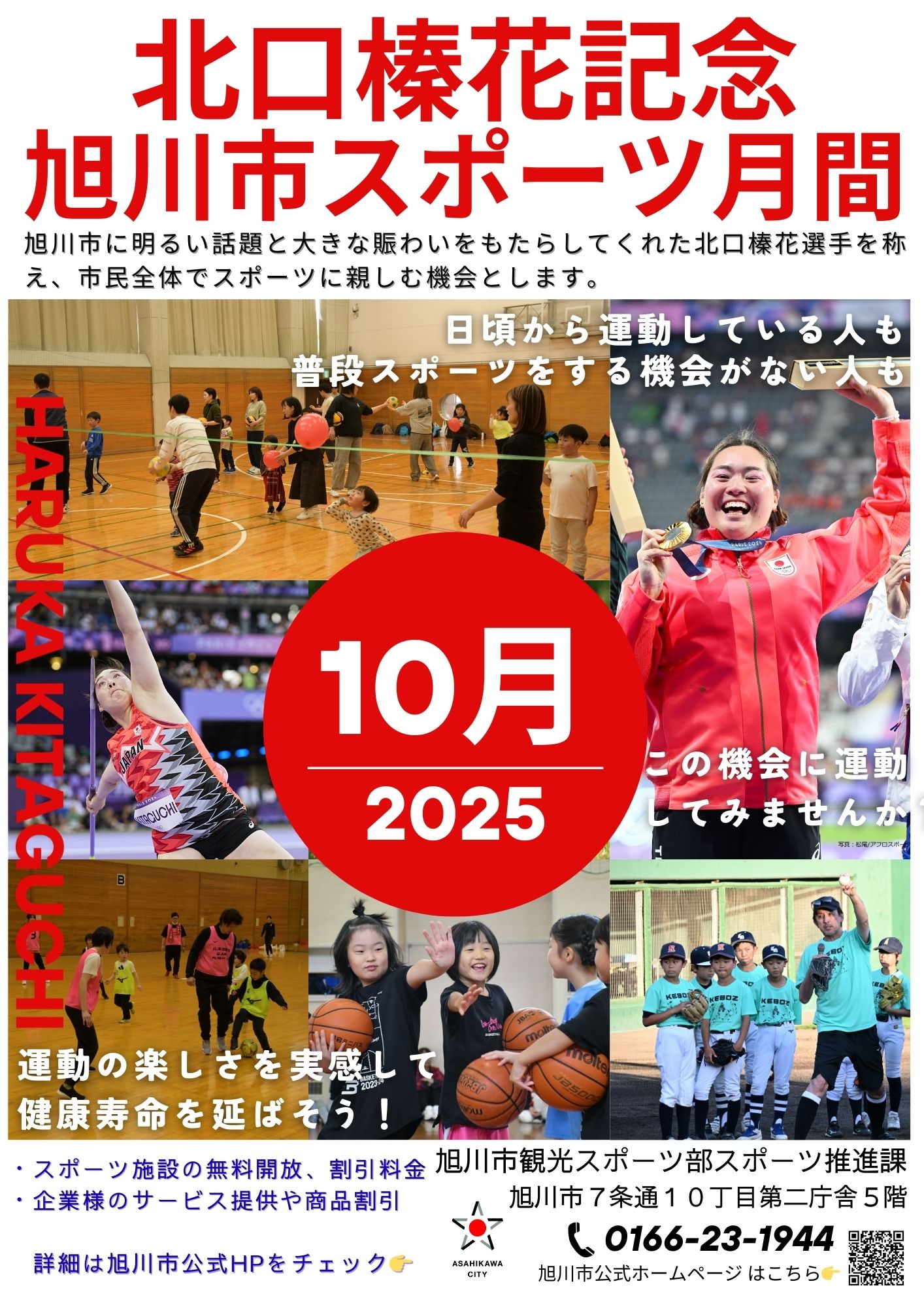 市民に明るい話題と大きな賑わいをもたらしてくれた北口榛花選手を称え、旭川市全体でスポーツに親しむ機会とするため、毎年「10月」を「北口榛花記念旭川市スポーツ月間 」としました。