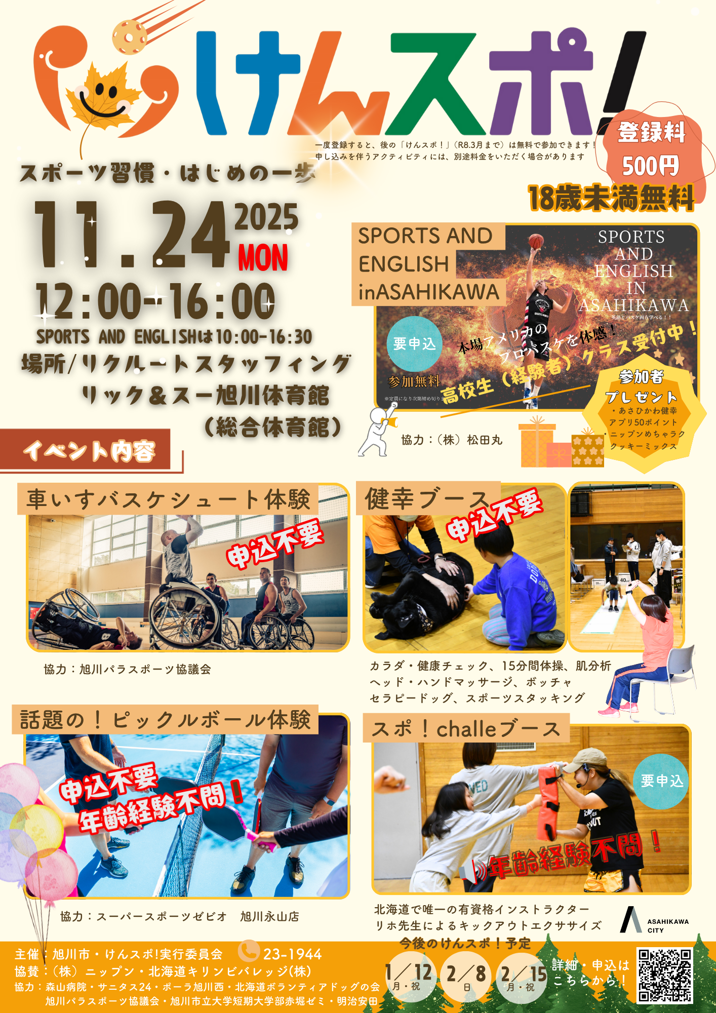 日時:令和7年11月24日(月曜日・祝日)12時~16時(SPORTS AND ENGLISH IN ASAHIKAWAのみ10時~16時30分)