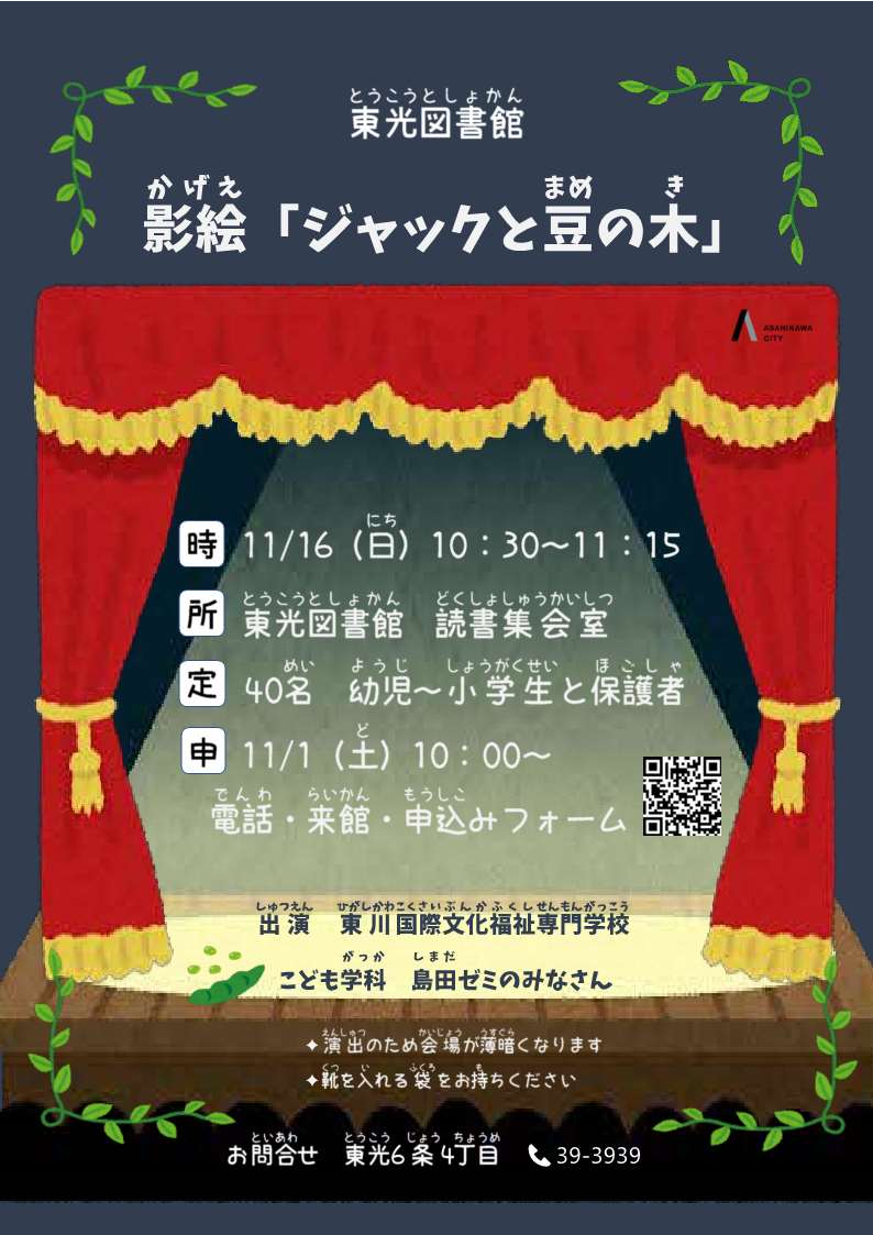 東川国際文化福祉専門学校こども学科島田ゼミの皆さんによる、影絵「ジャックと豆の木」を上演します。