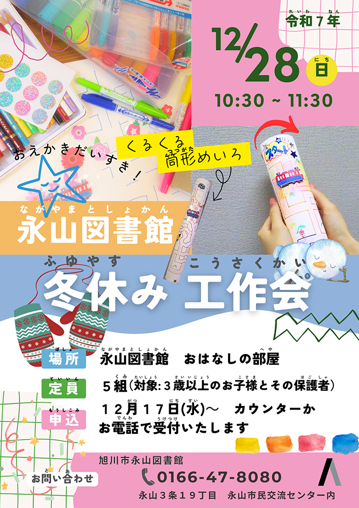 令和7年12月17日(水曜日)10時より、永山図書館カウンターまたは電話(47-8080)でお申し込みください。