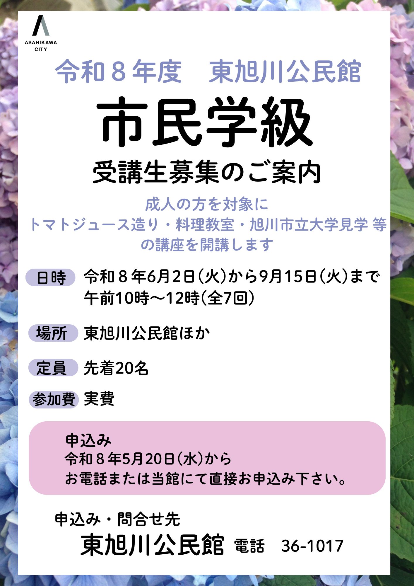 5月20日(水曜日)からお電話(電話番号36-1017)または東旭川公民館にて直接お申込み下さい。