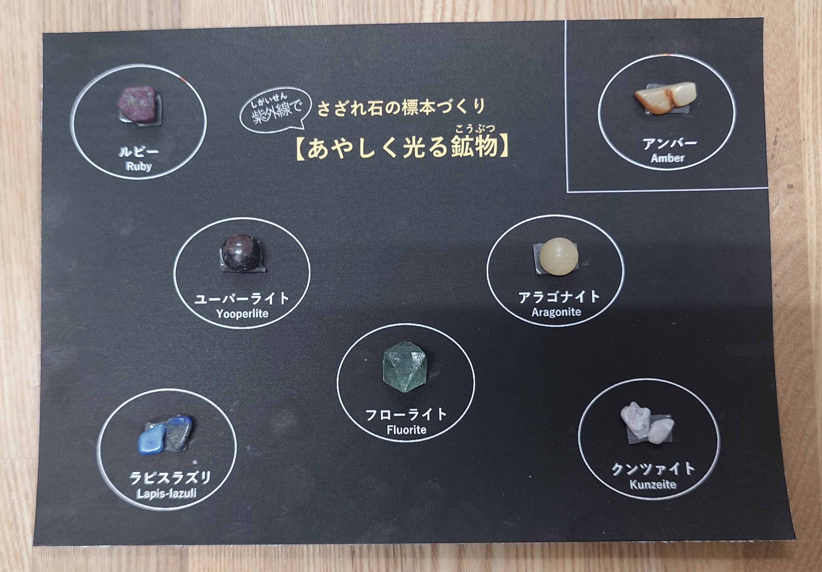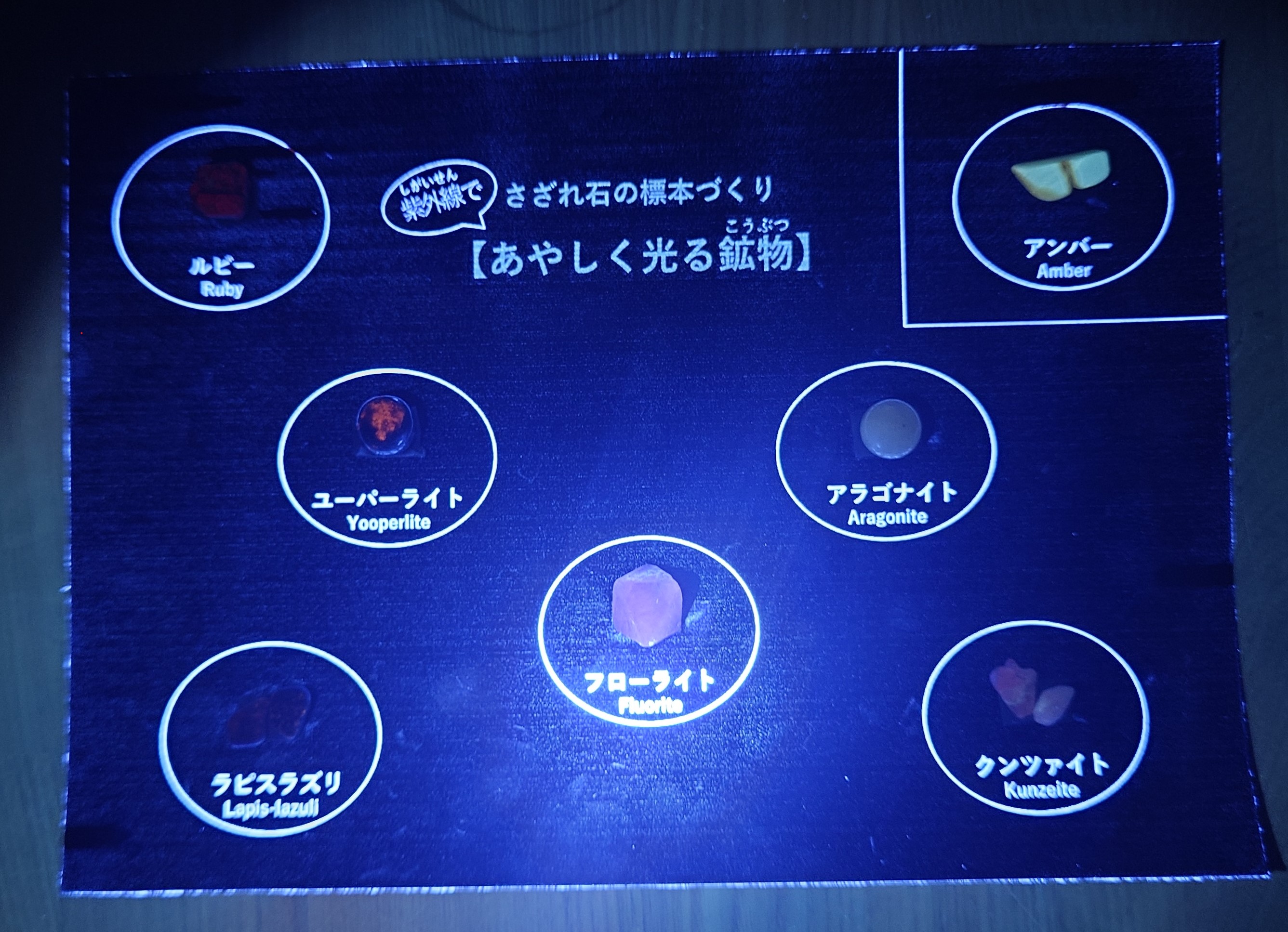 内 容:「蛍光鉱物」を7種類集めて標本を作り、紫外線で光る様子を観察します。