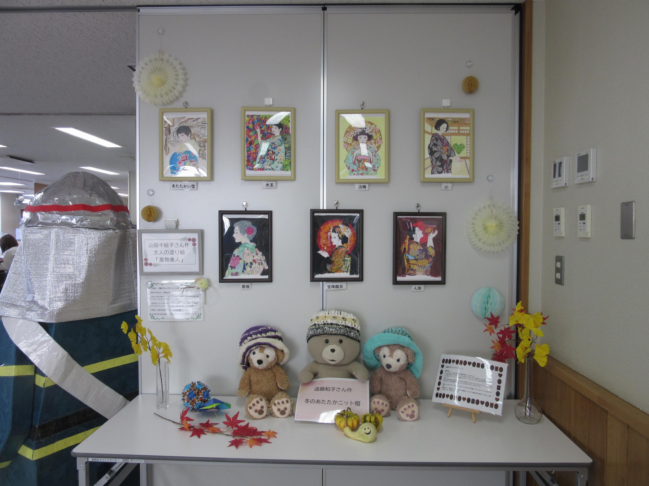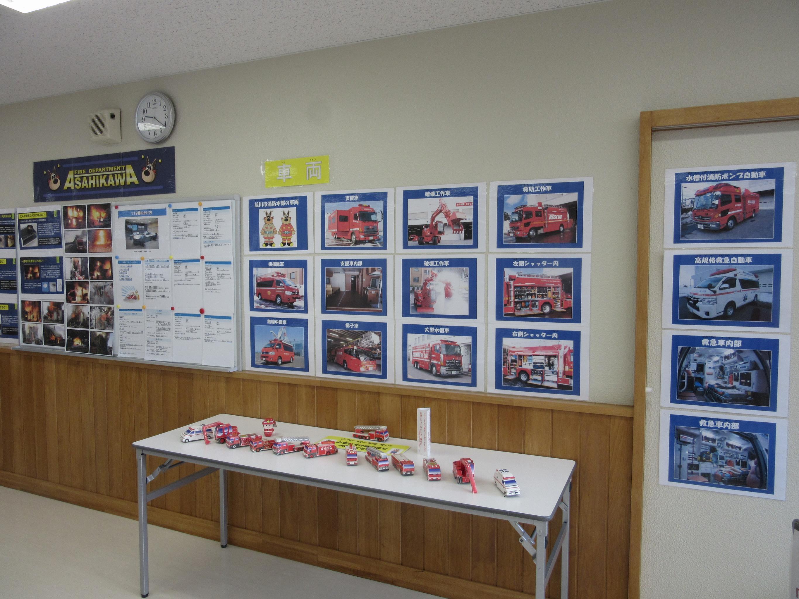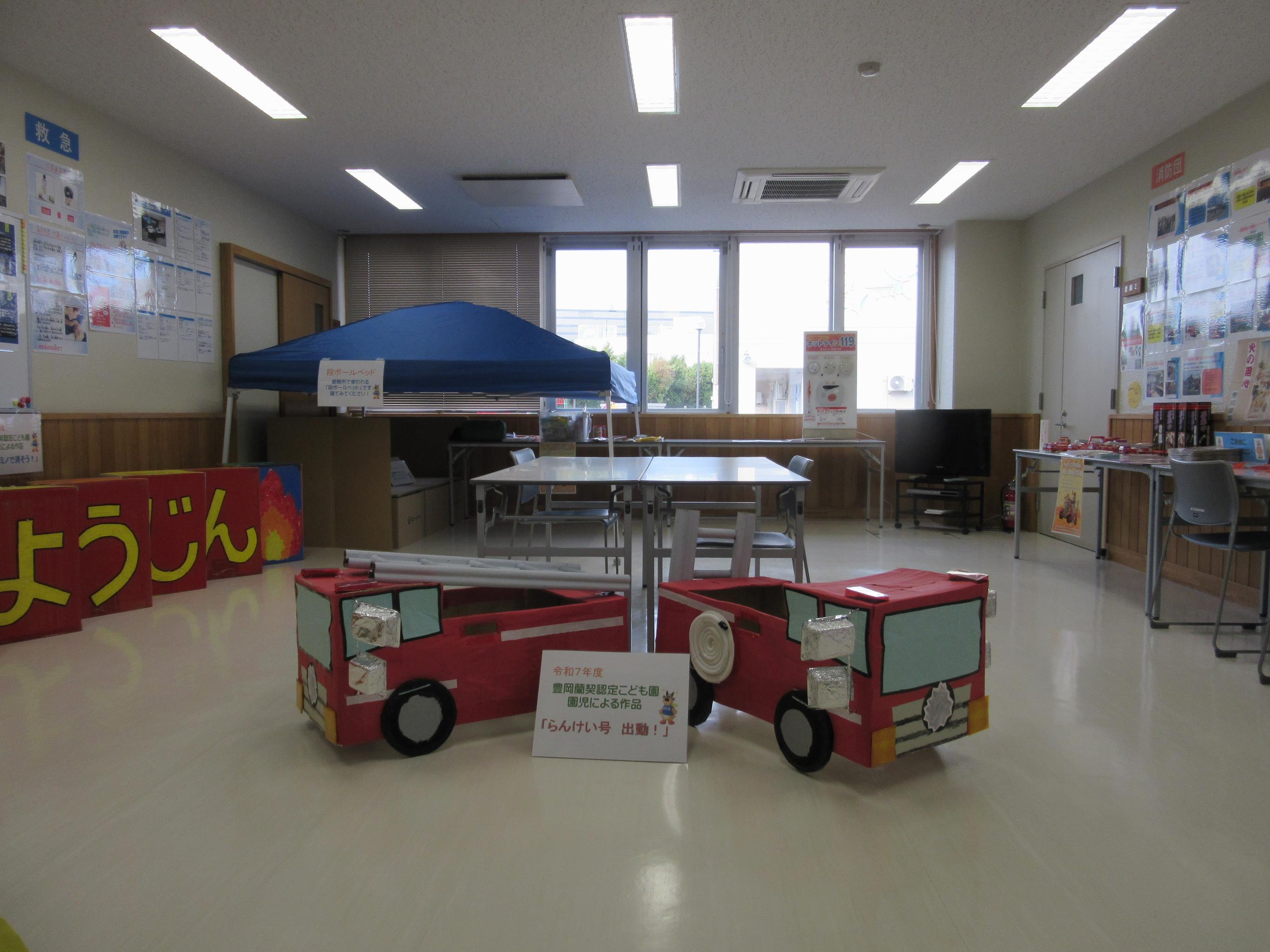 火災予防の啓発と東部まちづくりセンター内入所施設連携の一環として、秋の火災予防運動パネル展を実施しました。隣接する豊岡蘭契認定こども園から、園児の皆様による作品「らんけい号出動!」を提供いただき、過去の作品も合わせて展示しました。