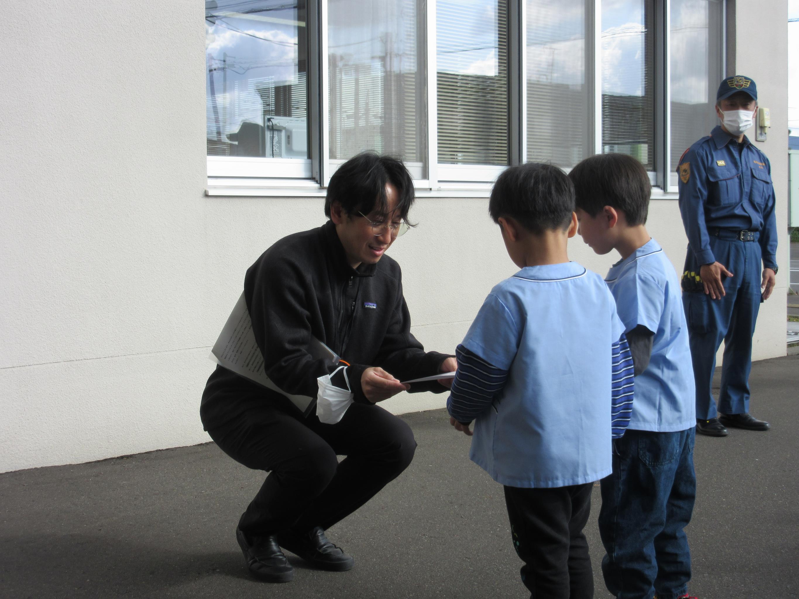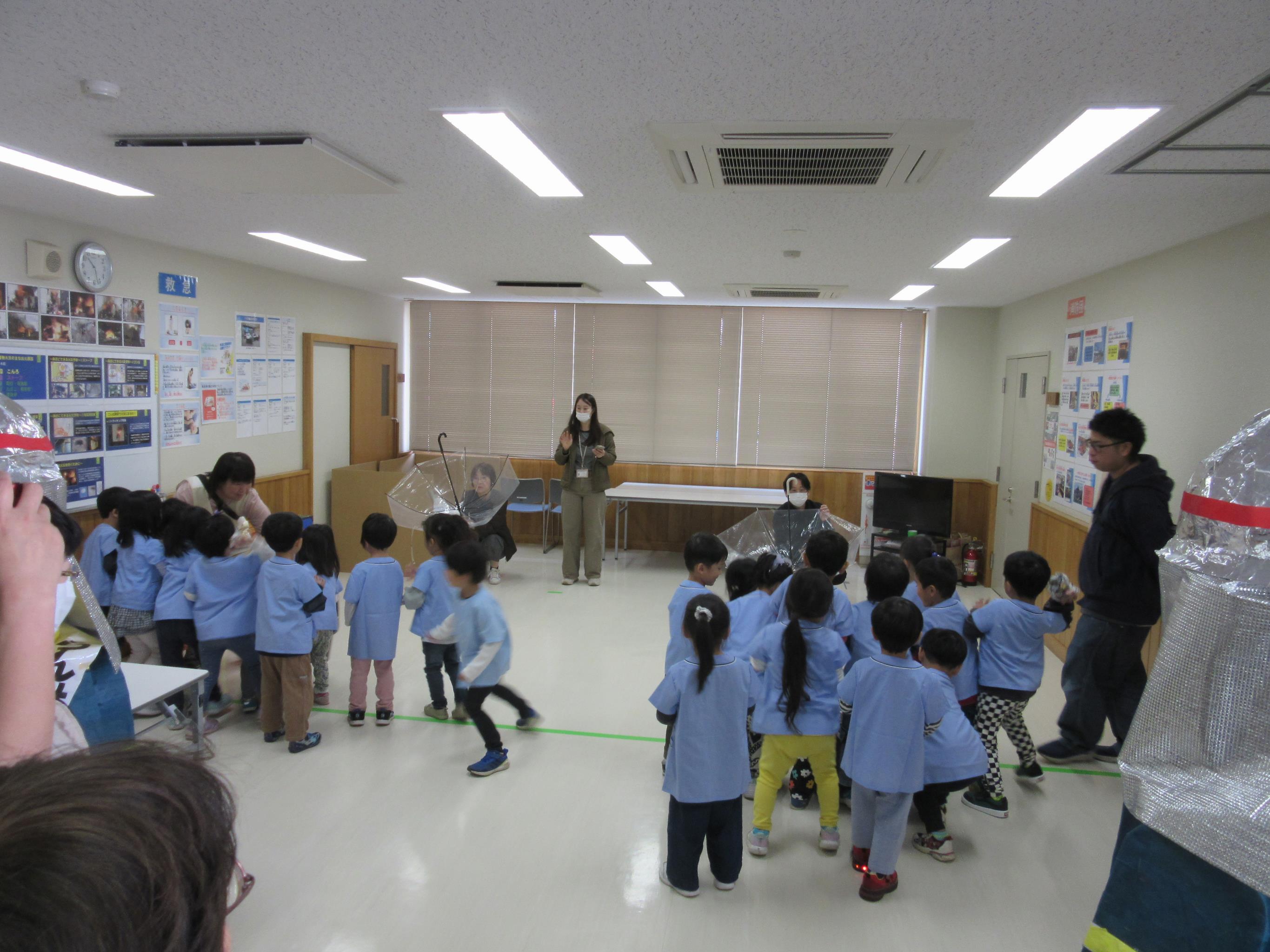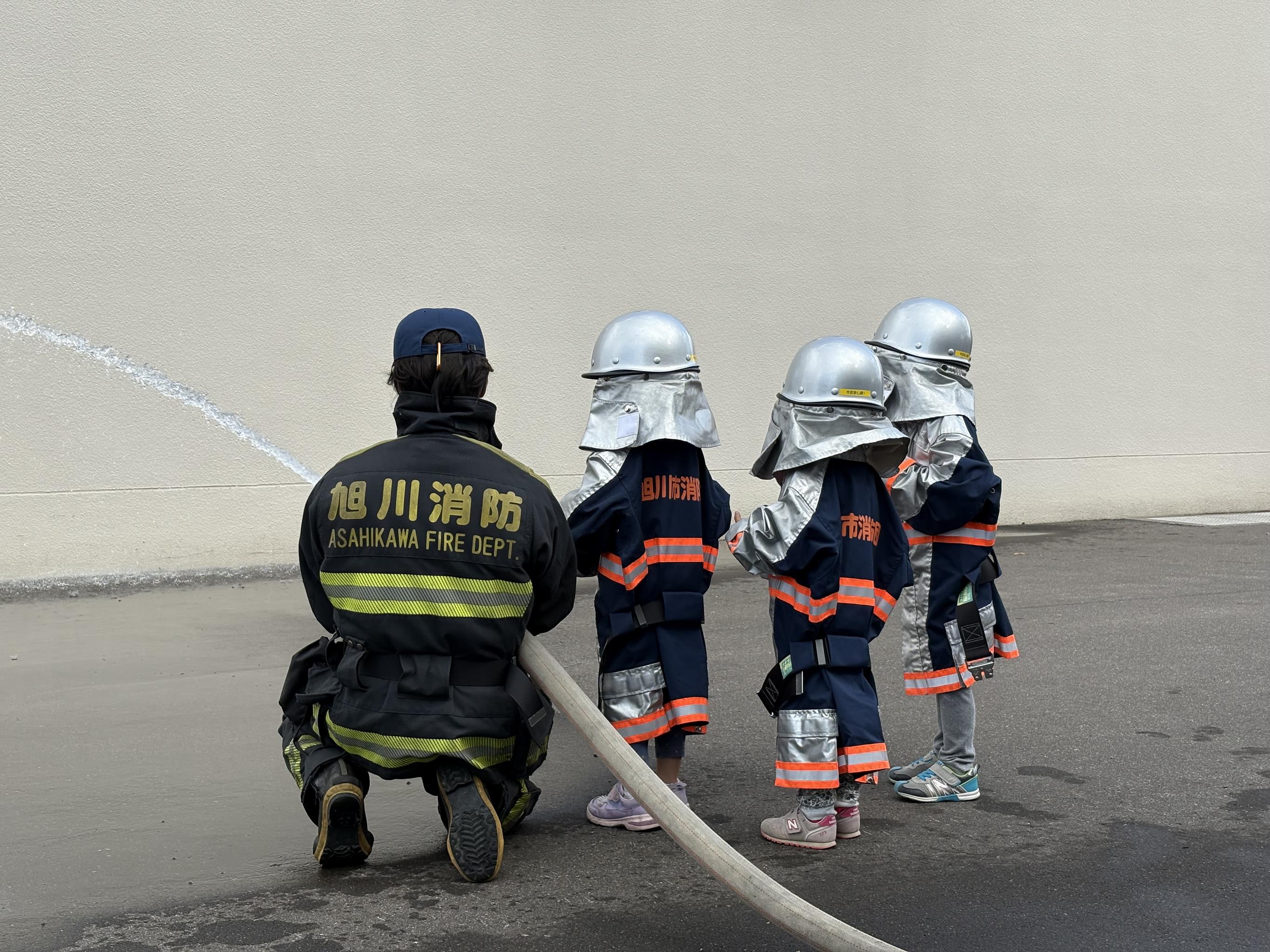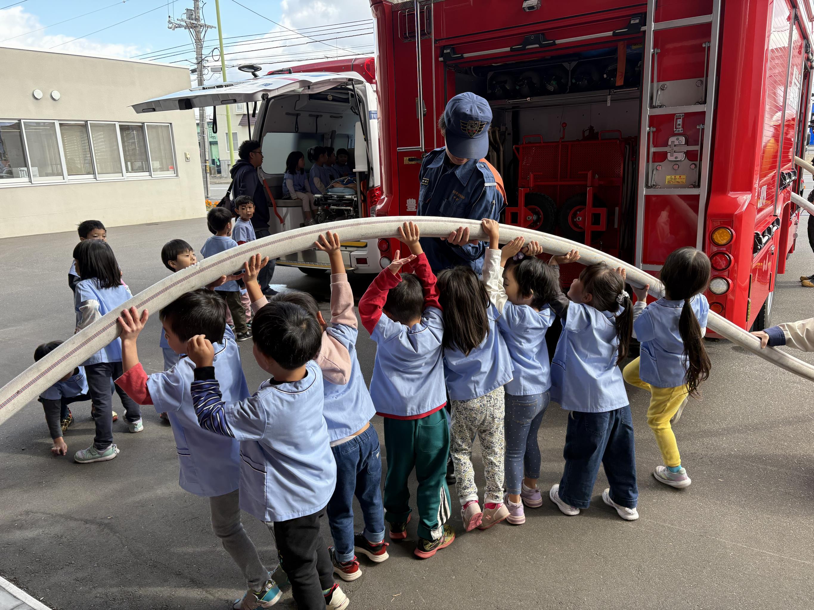 パネル展初日には、作品提供のお礼も兼ねて消防職員主導による園児の放水体験や、救急車の乗車体験のほか、豊岡地域包括支援センター職員が企画した、新聞紙と傘を活用した「玉入れ」をチーム戦で実施し、とても賑やかで楽しいひとときとなりました。期間中は多くの地域の方々に観覧いただき、豊岡地域包括支援センターの繋がりで地域サークルから提供いただいた「大人の塗り絵」や「水彩画」、「あたたかニット帽」といった作品にも注目が集まりました。