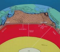 ![]() 今から約2億5000万年前、地球にはパンゲアと呼ばれる巨大大陸があったと考えられています。やがてそれが分裂して、現在のような海陸分布になっていきました。 現在のプレート移動がこれからも継続すると仮定するならば、遠い未来、オーストラリア大陸は日本と結合し、東アフリカは大陸から分裂すると推定されています。 |