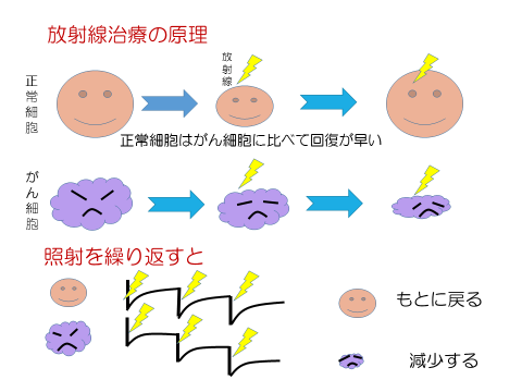 放射線を繰り返しあてることで、細胞にダメージを与えます。放射線によるダメージは、がん細胞を破壊したり、細胞分裂する能力をなくしたりしてやがて死滅します。一方で健康な細胞もダメージを受けるため副作用が現れますが、ある程度は自らを修復することができるため時間の経過とともに回復します。