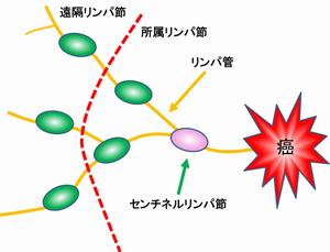 センチネルリンパ節とは “見張りリンパ節”とも呼ばれ 癌から最初に悪性細胞が流れ込むリンパ節になります。 センチネルリンパ節に癌の転移が なければ、その先のリンパ節には 転移がないものと考えます。 |