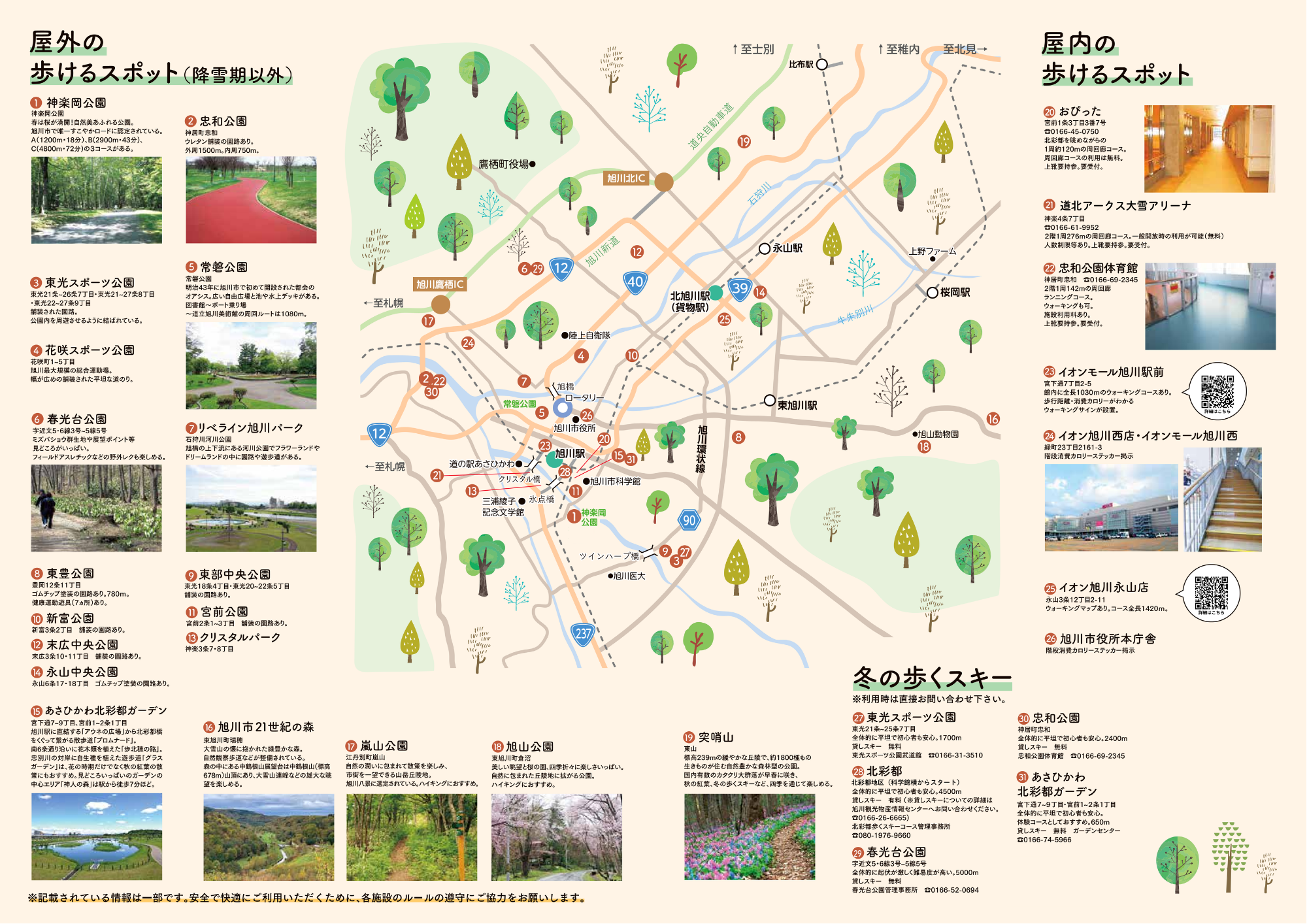 屋外の歩けるスポット(降雪期以外)、屋内の歩けるスポット、冬の歩くスキースポットを紹介しています。