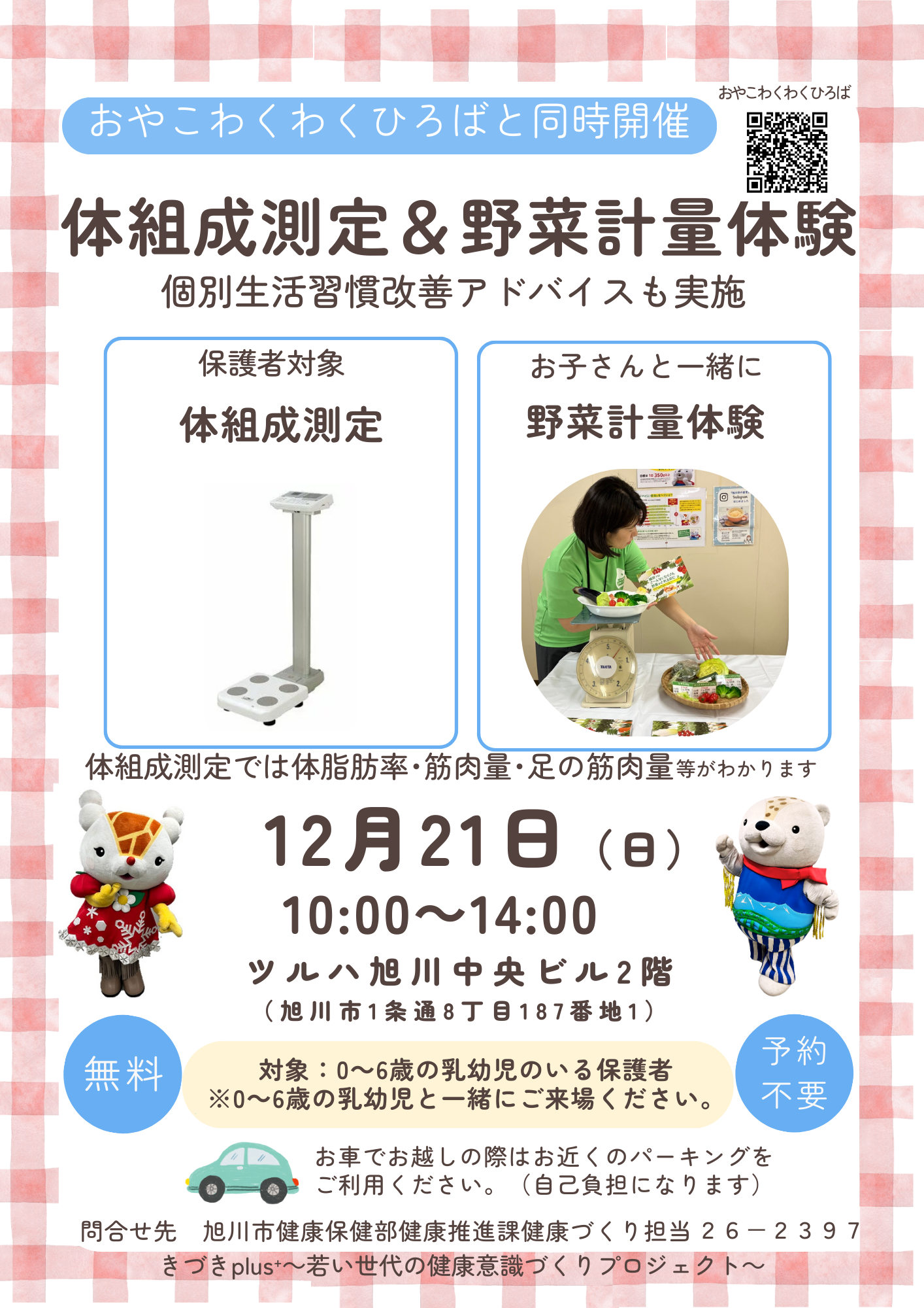 旭川市健康推進課では、0~6歳の乳幼児のいる保護者を対象とした体組成測定&野菜計量体験を開催します。