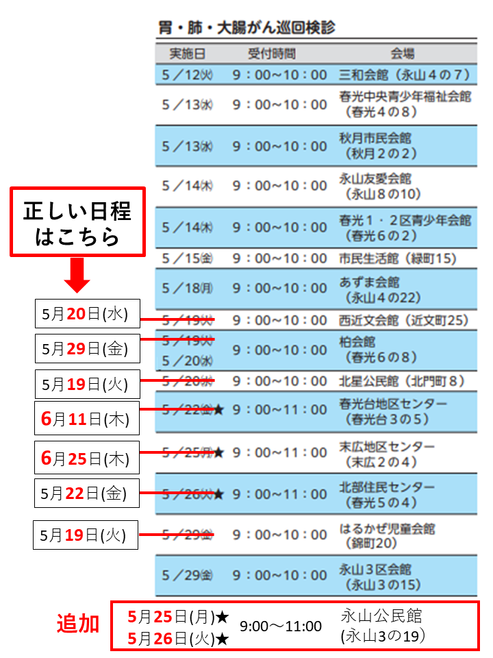 令和8年度胃・肺・大腸がん巡回検診の日程一覧