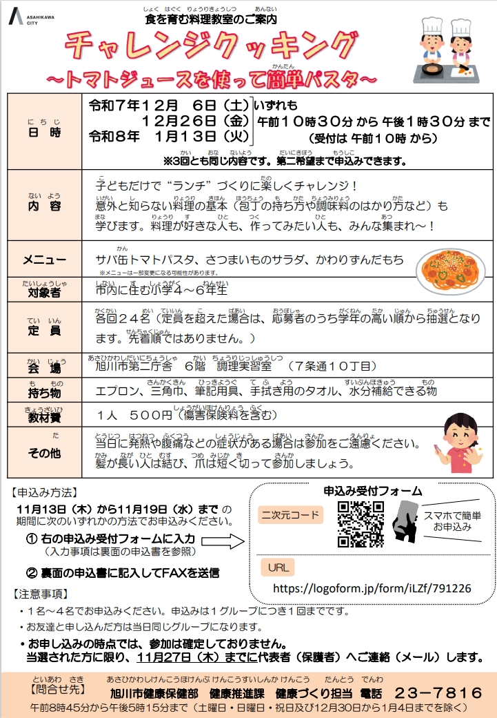 旭川市では、市民の皆様が料理に親しみ、食に対する関心や理解を深められるように食を育む料理教室を開催します。