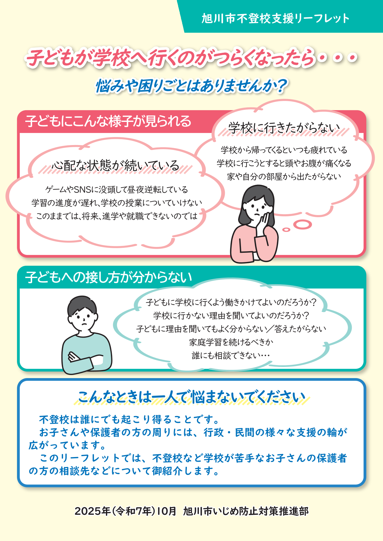 不登校支援リーフレットは、お子さんが学校へ行くのがつらくなったときに、相談する窓口や学校内で受けられる支援、学校外(民間の支援団体)での支援先について紹介しています。
