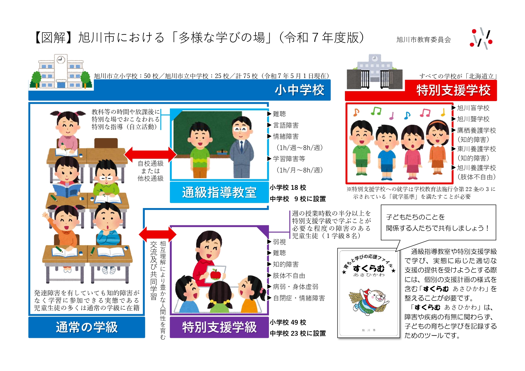 旭川市立の小・中学校では、発達障害や知的障害、肢体不自由などの特別な教育的ニーズのある児童生徒に対し、多様な学びの場において一人一人の実態に応じた指導や支援を行っております。