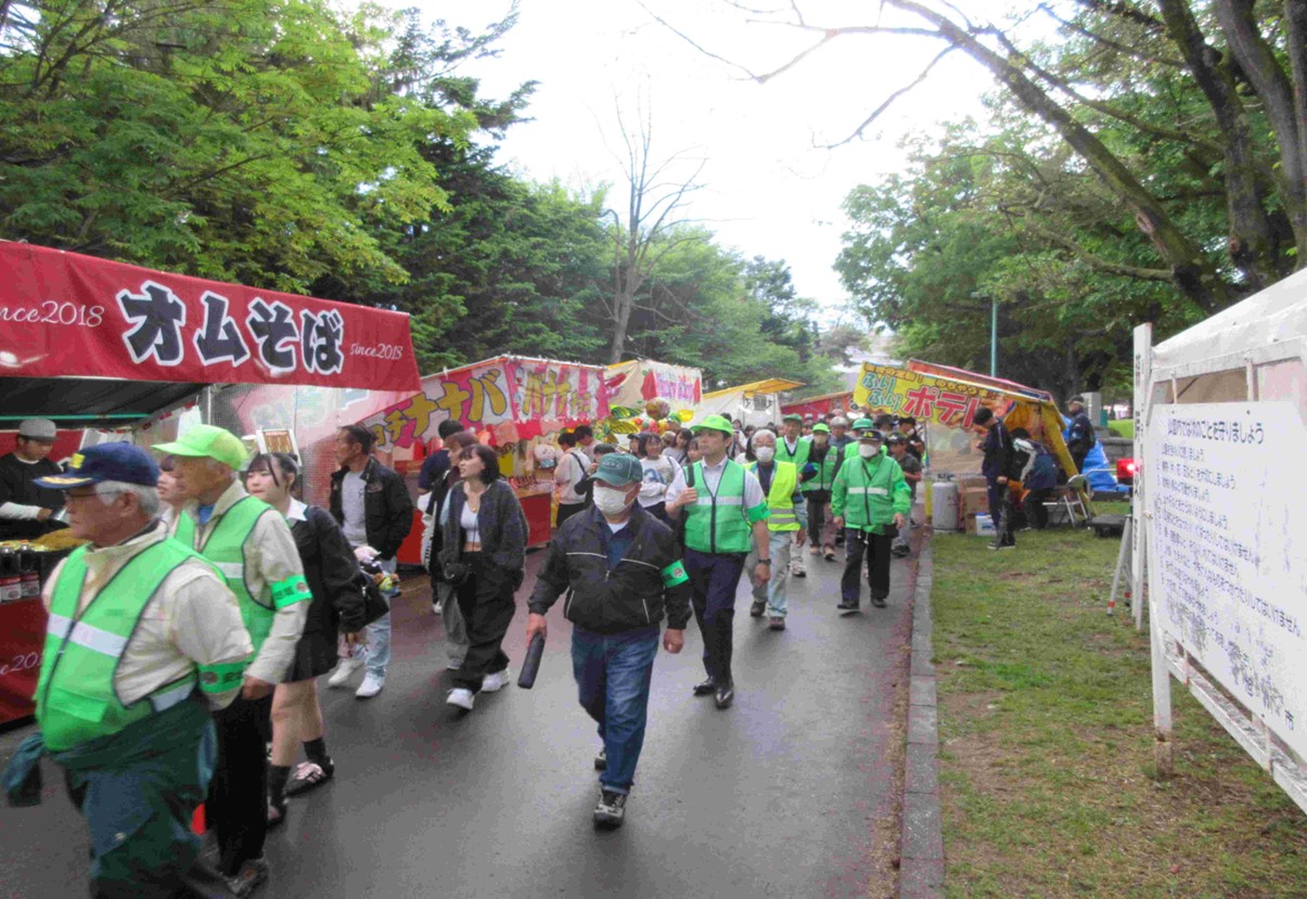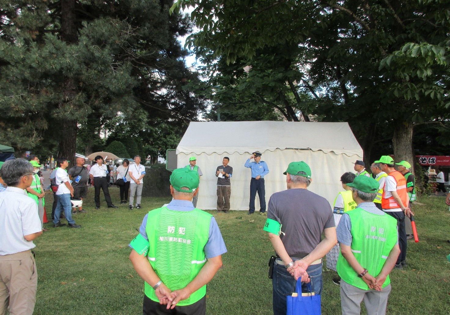 護国神社祭・上川神社祭の執行に合わせ、常磐公園の露店街等で「見せる防犯巡回啓発」を実施しています。