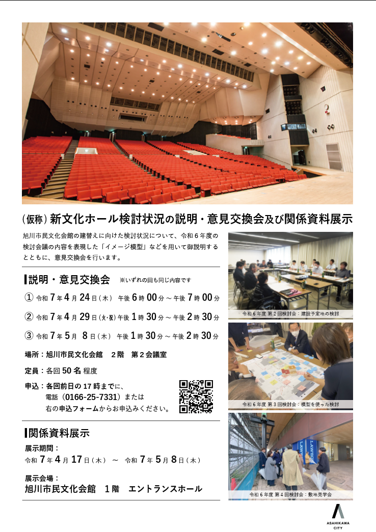 旭川市民文化会館の建替えに向けた検討の状況について、令和6年度の「旭川市民文化会館整備基本計画検討会」での議論の内容を中心とした説明資料の展示を行います。