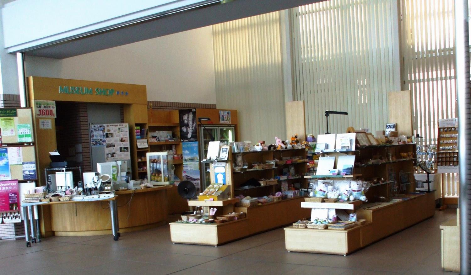 正面玄関を入ると右横(博物館側)に売店(ミュージアムショップ)があります。飲み物や菓子類、小物、博物館関係の書籍やグッズ、旭川・札幌間の高速バスチケットなどを販売しています。その他、ファックスサービスや各種コンサートのチケット(大雪クリスタルホール自主文化事業公演を除く。)等も取り扱っています。なお、ホールで行われる催事でも、チケットをお取扱していない場合があります。