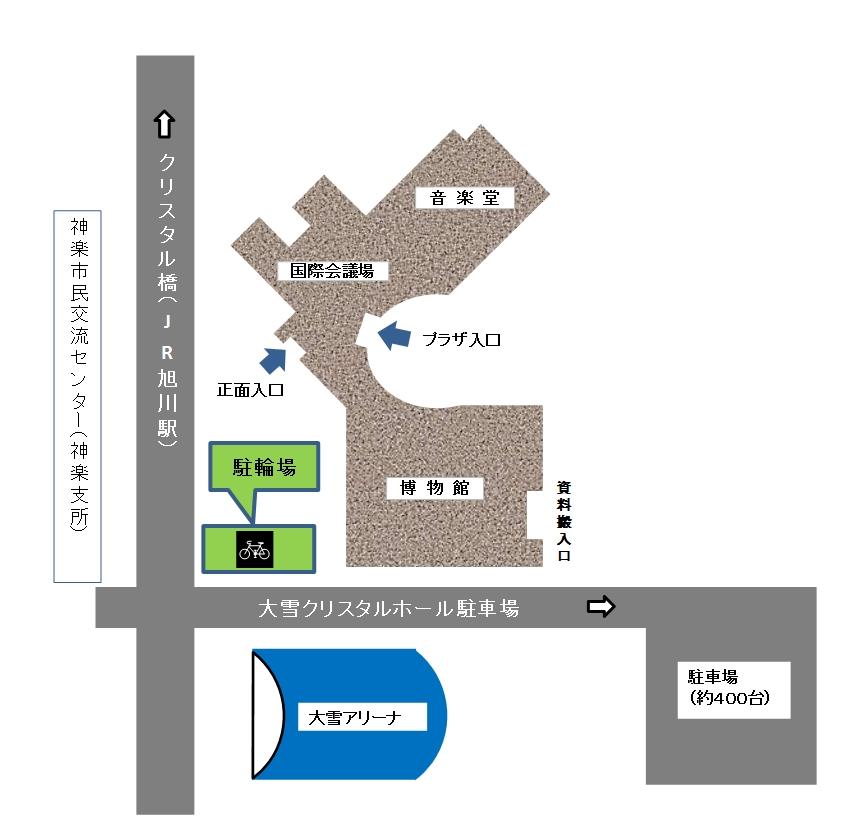 交通のご案内(PDF形式 152キロバイト)を御確認ください。旭川駅から来る場合、徒歩で10分程度です。隣にある「道北アークス大雪アリーナ」(屋根がかまぼこ型の大きな建物)を目指していただくと、駅方面からクリスタル橋を渡ってきた場合は道北アークス大雪アリーナの手前が大雪クリスタルホールとなります。