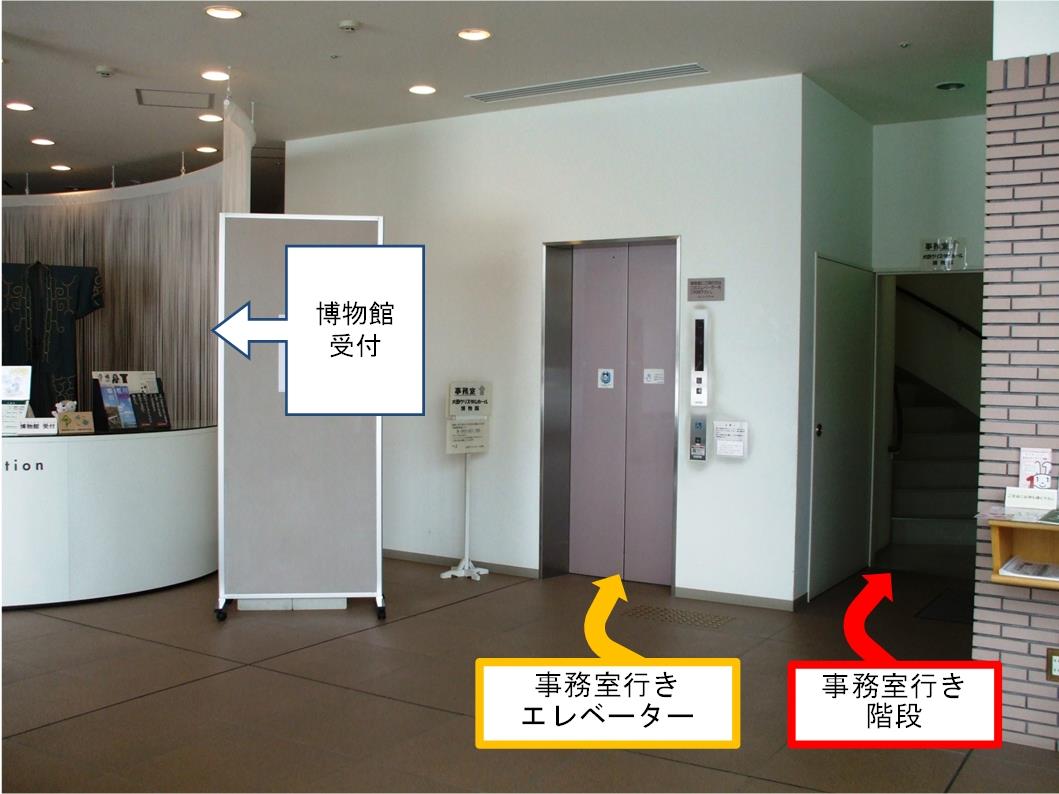 正面玄関から入り、右手に進むと博物館があります。博物館受付の手前にあるエレベーターまたは階段を上がると2階が事務室です。