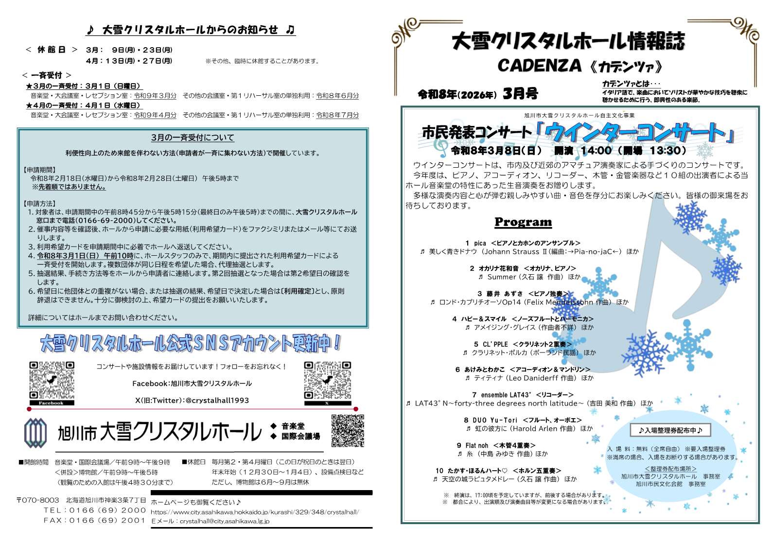 バックナンバーは大雪クリスタルホール情報誌CADENZA《カデンツァ》バックナンバーのページを御覧ください。