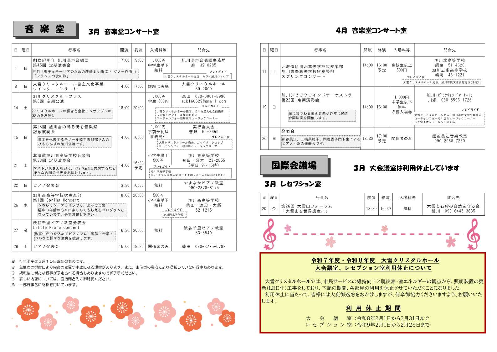 ※大雪クリスタルホールが主催する自主文化事業が諸事情により延期や中止となった場合は、当ホームページ等でお知らせします。それ以外の催事の開催等につきましては、主催者様へ直接お問い合わせくださいますようお願いします。