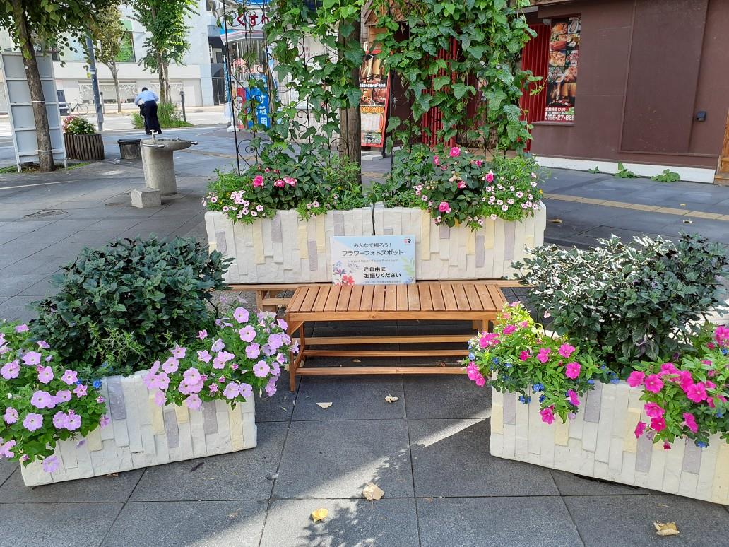 ベンチの周りにフラワーポットを飾り、花に囲まれた写真が撮影できるフォトスポットを買物公園内に5箇所、設置しました。