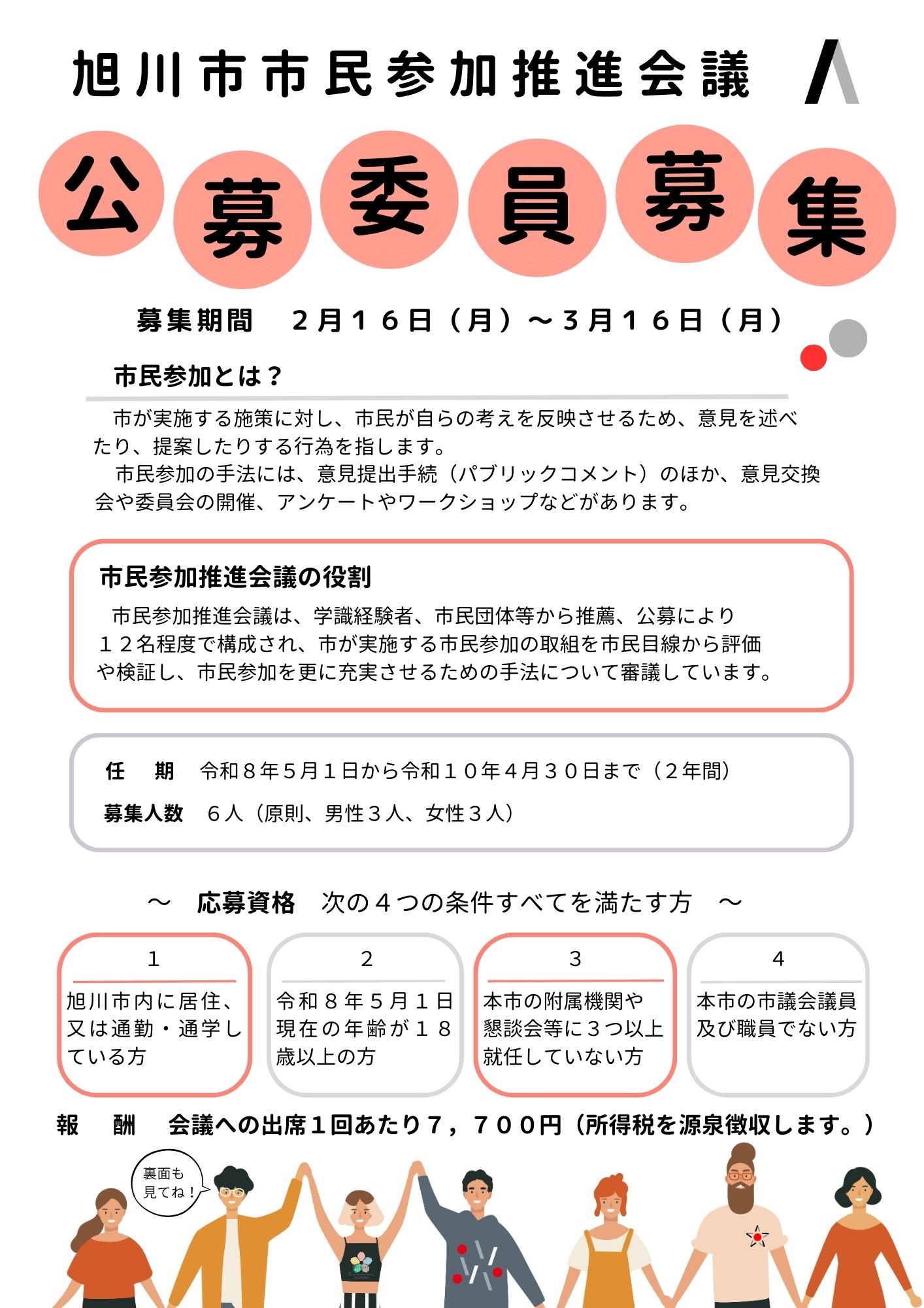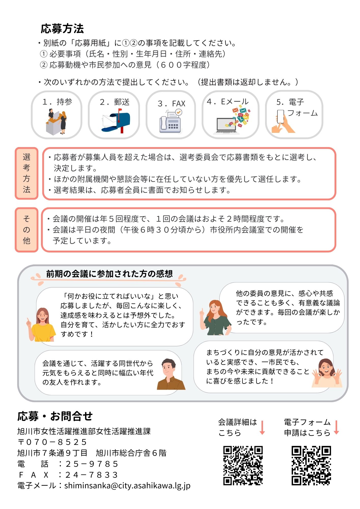 | 応募方法 | 女性活躍推進課(総合庁舎6階)、市政情報コーナー(総合庁舎1階)、各支所、市民活動交流センター(宮前1条3丁目3-30)、市ホームページにある所定の応募用紙に、必要事項・応募動機と市民参加についての意見を600字程度で記載し、持参、郵送、FAX、電子メールまたは電子フォームで女性活躍推進課に提出してください。 |