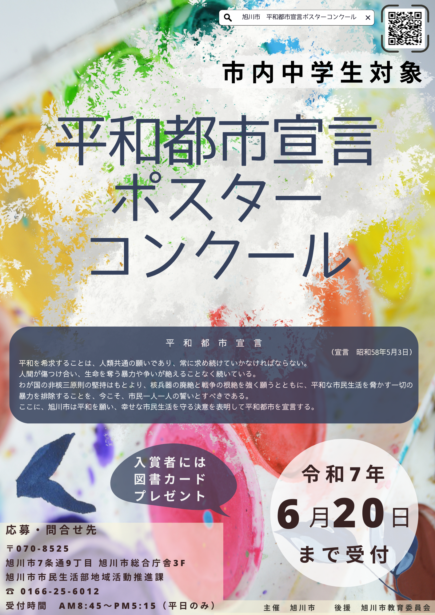 その一環として、次代を担う生徒の皆さんに平和なまちづくりについて理解と関心を持っていただき、平和とは何かを考える第一歩なることを願って「平和都市宣言ポスターコンクール」を実施します。