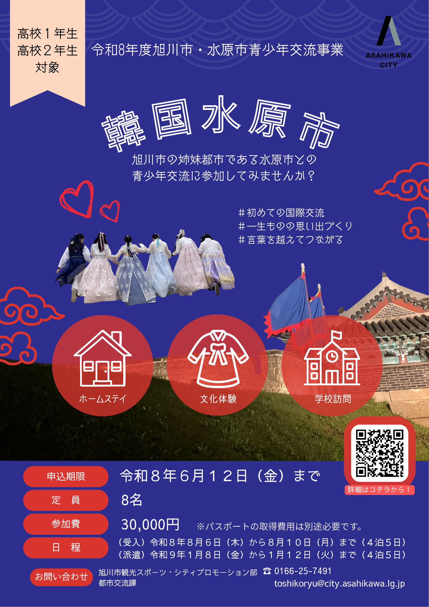 「令和8年度旭川市・水原市青少年交流 参加申込書兼承諾書」に必要事項を記入し、令和8年6月12日(金)までに旭川市観光スポーツ・シティプロモーション部都市交流課(お問い合わせ先参照)へ持参もしくは郵送(必着)してください。
